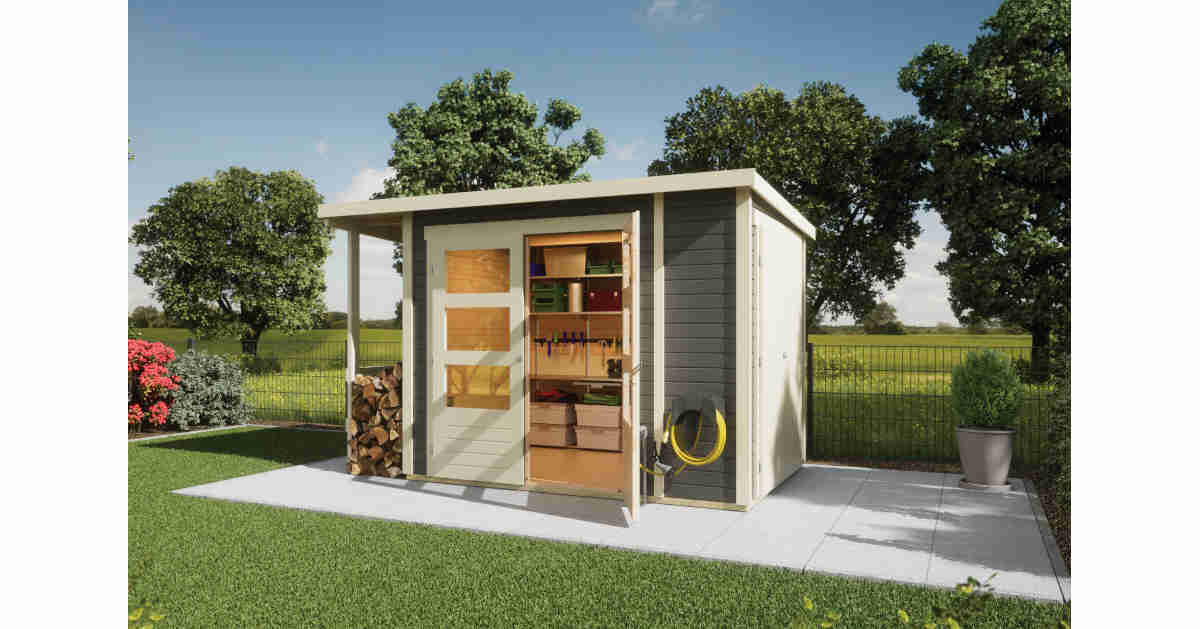 Kundenbewertungen für "Karibu Multifunktionshaus 19mm Pultdach mit Schrank und Anbaudach terragrau"