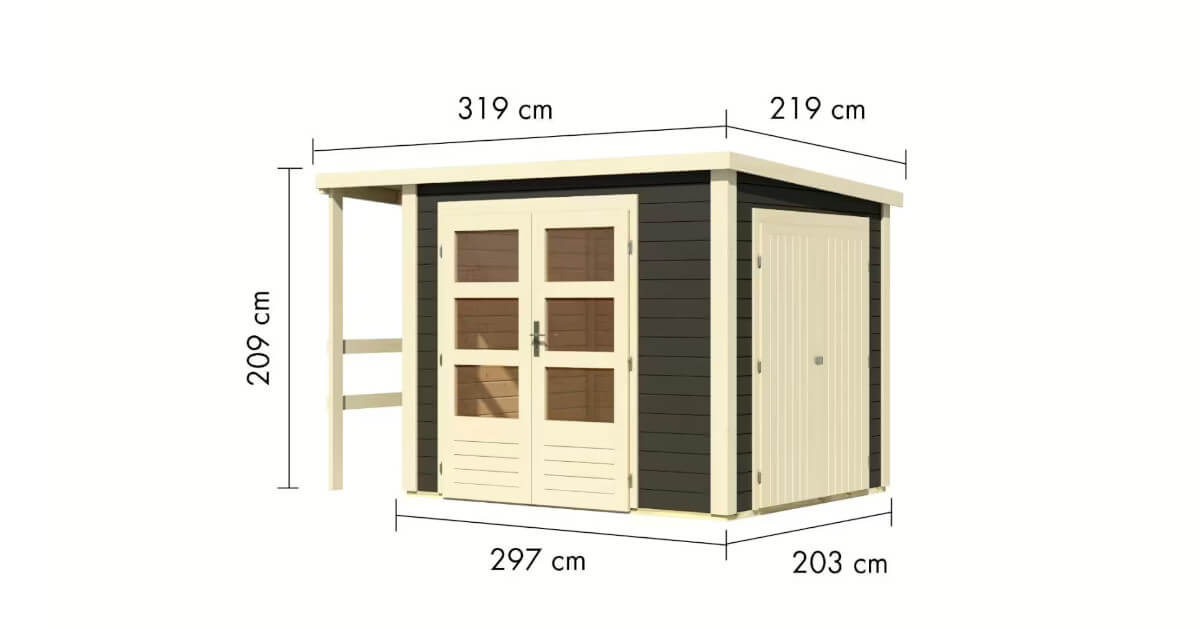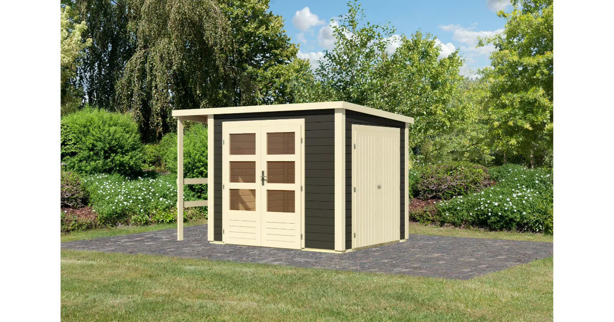 Karibu Multifunktionshaus 28mm Pultdach mit Schrank und Anbaudach terragrau
