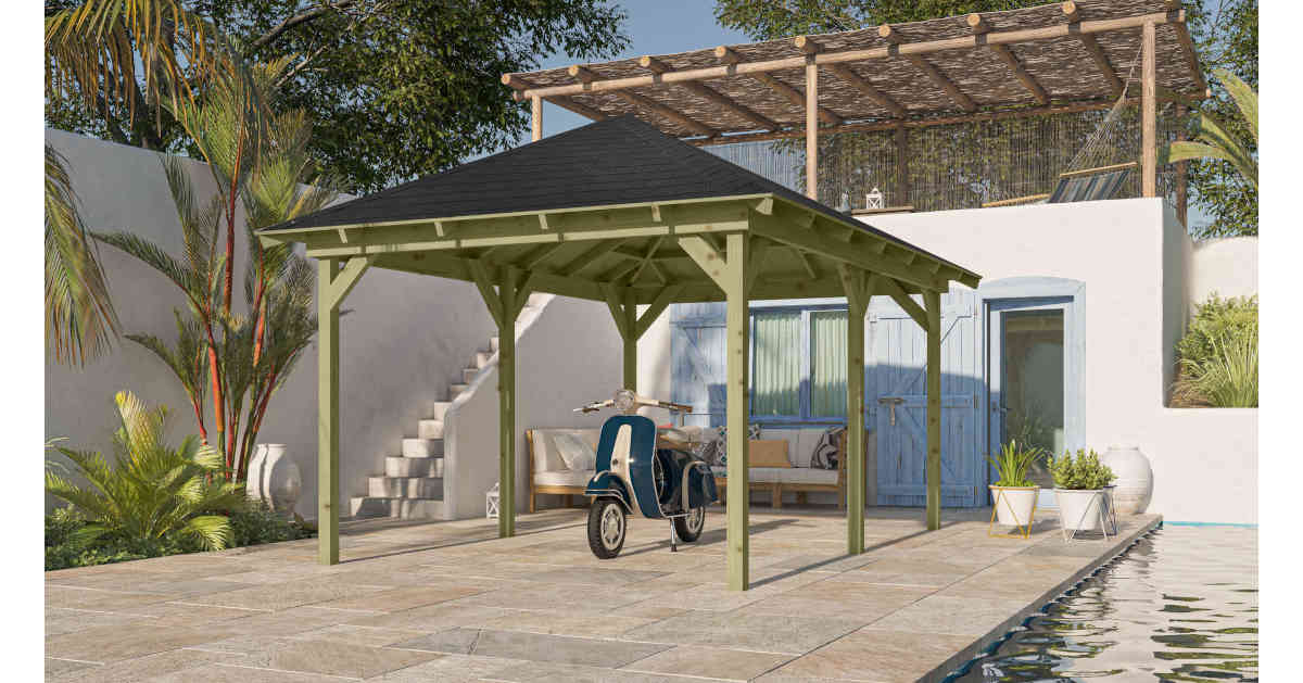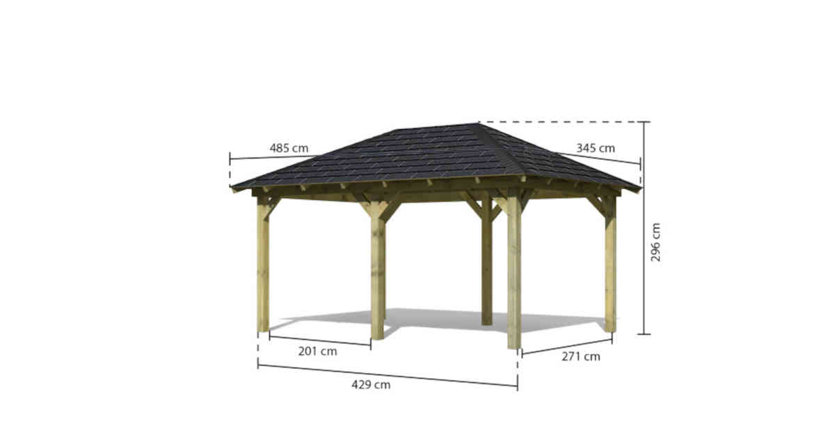 Mit einem Außenmaß von (BxT) 289x429cm bietet er genügend Platz für eine gemütliche Sitzgruppe, einen Tischkicker oder einer Tischtennisplatte im eigenen Garten. Das Dach mit einer Dachfläche von 16m² wird von sechs 9x9cm starken kesseldruckimprägnierten Massivholzpfosten getragen. Schaffen Sie sich einen gemütlichen Ort im Garten, der zum Entspannen, Wohlfühlen und Beisammensein einlädt. Auch an einem grauen Sommertag müssen Sie nun die Zeit nicht im Haus verbringen. Lauschen Sie dem Prasseln des Sommerregens, genießen Sie ein leckeres Frühstück im Garten unter dem schützenden Dach oder veranstalten Sie eine kleine Grillparty.