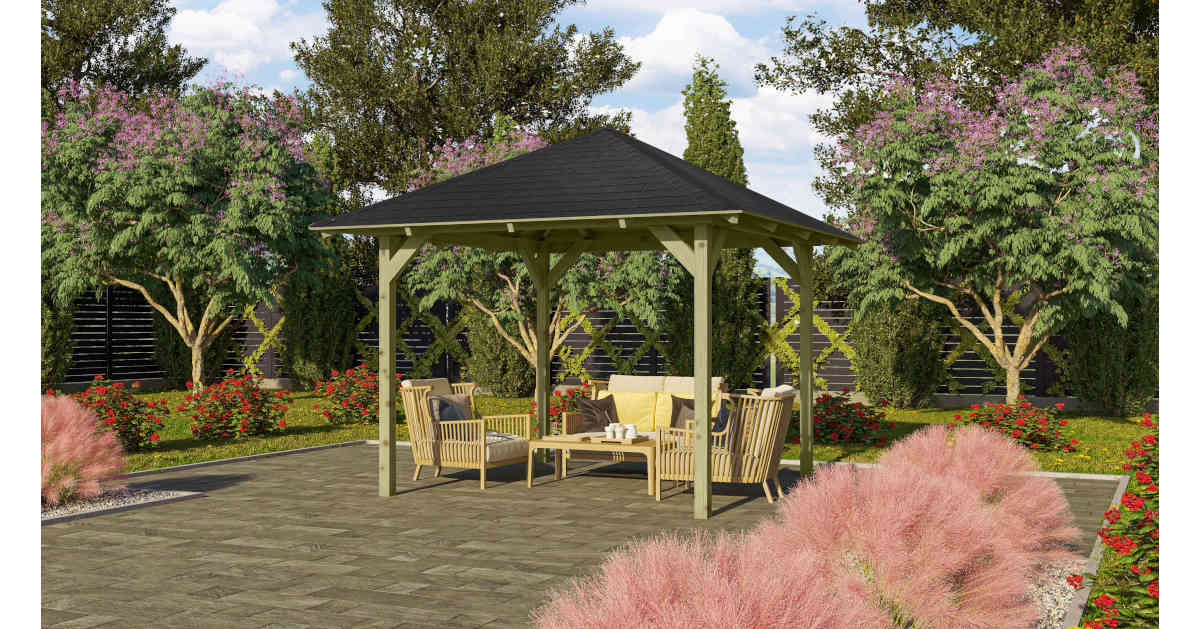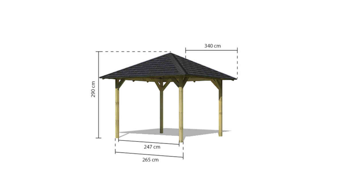 Gestützt durch vier 9x9cm starke kesseldruckimprägnierte Massivholzpfosten schafft der Pavillon Sevilla einen geschützten Ort im Garten. Hier können Sie sich nach einem anstrengenden Arbeitstag zurückziehen und entspannen. Gestalten Sie sich Ihren Pavillon nach den eigenen Wünschen. So können Sie sich einen gemütlichen Rückzugsort im Garten schaffen mit zwei Liegen oder vielleicht doch mit einer bequemen Sitzgruppe? Eine Lichterkette an der Dachkonstruktion schafft ein schönes Licht und ein warmes Ambiente. Am Wochenende eignet sich der Pavillon ideal für ein leckes Frühstück im Garten, als ruhiger Ort, um ein Buch zu lesen am Nachmittag oder für ein gemütliches Grillen und Beisammensein am Abend mit Freunden und Familie. Der Pavillon Sevilla bietet Ihnen zahlreiche Möglichkeiten. Verkleidet mit optional erhältlichen Dachschindeln können Sie dem Pavillon den letzten Schliff verleihen und ein Highlight in Ihrem Garten setzen. Auf die Spitze des 12,8m² großen Daches rundet eine optional erhältliche Pavillonhaube das Gesamtbild ab. Die Grundfläche von 7m² bietet Ihnen ausreichend Platz für eine gemütliche Ess- oder Sitzgruppe. Ein angenehmer Stand ist bei einer Firsthöhe von 290 cm ebenfalls möglich. Genießen Sie Ihren Garten in vollen Zügen mit dem Pavillon Sevilla.
