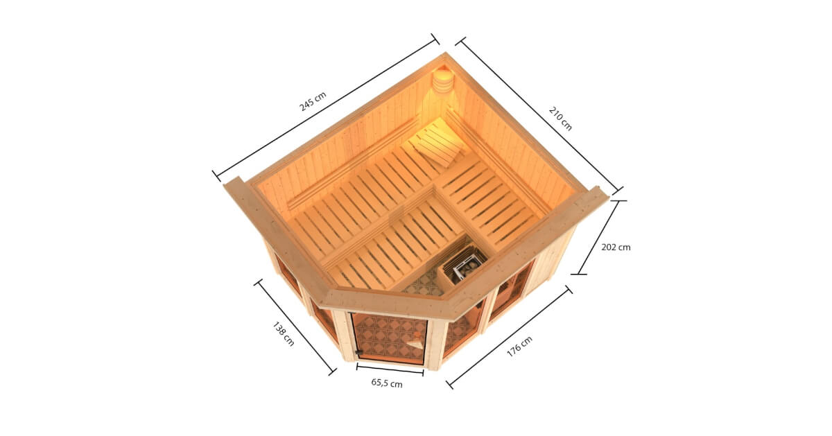 Genau die Entspannung, die Sie sich wünschen. Ein heller und geräumiger Innenraum, der keine Wünsche offen lässt. Nutzen Sie die warme und beruhigende Saunaluft und stärken Sie Ihr Herz-Kreislauf-System. Fördern Sie die Durchblutung der Schleimhäute und fördern so die Heilung von Atemwegsinfekten. Mit der Systemsauna Ainur tun Sie gleichzeitig etwas für Körper und Seele. Ausgestattet mit einem 9kW-Saunaofen, drei Saunaliegen aus weichem Espenholz, Bankblenden und Rückenlehnen, einem Ofenschutzgitter-Premium und einer Kopfstütze bringt die Sauna bereits alles mit, was Ihr Herz begehrt. Nach einem langen und harten Arbeitstag im Büro möchte sich jeder Entspannung und das so effektiv wie möglich. Dies gelingt nun kinderleicht mit einem ausgiebigen Saunabad. Im Nu sind Ihre Muskeln entspannt und der Alltagsstress vergessen. Mit den Außenmaßen 231 x 196 x 198 cm (B/T/H) ohne Dachkranz bietet die Sauna genug Platz für Sie und Ihre Liebsten. Genießen Sie die Möglichkeiten alleine oder mit der ganzen Familie. Die Saunabänke verfügen über eine Breite von 57 cm und ermöglichen so ein angenehmes Liegen während des Saunierens. Bei dem Ofen können Sie zwischen einem 9kW-Ofen mit integrierter Steuerung oder einem Ofen mit externerer Steuerung Easy wählen. Oder Sie entscheiden sich für einen 9kW-Bio-Kombiofen mit externer Steuerung Easy. Der Bio-Kombiofen verfügt, neben der klassischen finnischen Sauna, auch über eine Verdampfer-Einheit. Dies ermöglicht auch eine Kräuterdampf-Kur, ein Soft-Dampfbad-Feuchtwarm und eine Familiensauna. So ist garantiert für jeden das Richtige dabei. Ein echtes Highlight bieten die vier großzügigen Fenster in der Sauna. Diese lassen viel Tageslicht in das Innere und sorgen durch das bronzierte Glas für ein schönes Ambiente. Betreten können Sie die Sauna durch eine bronzierte Ganzglastür aus Einscheibensicherheitsglas mit Karibu-Türgriff. Die Wandelemente bestehen aus einer 68mm Rahmenkonstruktion mit Mineralwolldämmung und nordischen Fichtenbrettern. Machen Sie die Systemsauna unserer Superior-Reihe Ainur zu Ihrem ganz persönlichen Highlight in Ihrer Wellness-Oase.