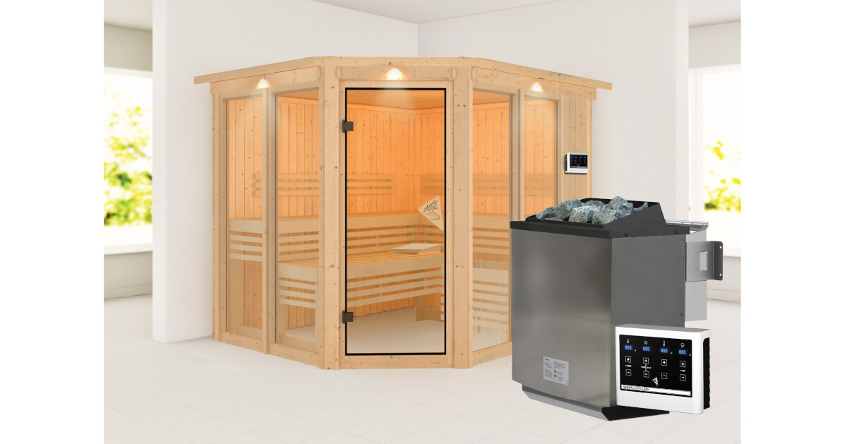 Karibu 68mm Systemsauna Ainur mit Dachkranz + 9kW BIO-Kombiofen mit ext. Steuerung Easy
