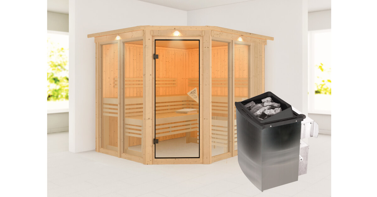 Genau die Entspannung, die Sie sich wünschen. Ein heller und geräumiger Innenraum, der keine Wünsche offen lässt. Nutzen Sie die warme und beruhigende Saunaluft und stärken Sie Ihr Herz-Kreislauf-System. Fördern Sie die Durchblutung der Schleimhäute und fördern so die Heilung von Atemwegsinfekten. Mit der Systemsauna Ainur tun Sie gleichzeitig etwas für Körper und Seele. Ausgestattet mit einem 9kW-Saunaofen, drei Saunaliegen aus weichem Espenholz, Bankblenden und Rückenlehnen, einem Ofenschutzgitter-Premium und einer Kopfstütze bringt die Sauna bereits alles mit, was Ihr Herz begehrt. Nach einem langen und harten Arbeitstag im Büro möchte sich jeder Entspannung und das so effektiv wie möglich. Dies gelingt nun kinderleicht mit einem ausgiebigen Saunabad. Im Nu sind Ihre Muskeln entspannt und der Alltagsstress vergessen. Mit den Außenmaßen 231 x 196 x 198 cm (B/T/H) ohne Dachkranz bietet die Sauna genug Platz für Sie und Ihre Liebsten. Genießen Sie die Möglichkeiten alleine oder mit der ganzen Familie. Die Saunabänke verfügen über eine Breite von 57 cm und ermöglichen so ein angenehmes Liegen während des Saunierens. Bei dem Ofen können Sie zwischen einem 9kW-Ofen mit integrierter Steuerung oder einem Ofen mit externerer Steuerung Easy wählen. Oder Sie entscheiden sich für einen 9kW-Bio-Kombiofen mit externer Steuerung Easy. Der Bio-Kombiofen verfügt, neben der klassischen finnischen Sauna, auch über eine Verdampfer-Einheit. Dies ermöglicht auch eine Kräuterdampf-Kur, ein Soft-Dampfbad-Feuchtwarm und eine Familiensauna. So ist garantiert für jeden das Richtige dabei. Ein echtes Highlight bieten die vier großzügigen Fenster in der Sauna. Diese lassen viel Tageslicht in das Innere und sorgen durch das bronzierte Glas für ein schönes Ambiente. Betreten können Sie die Sauna durch eine bronzierte Ganzglastür aus Einscheibensicherheitsglas mit Karibu-Türgriff. Die Wandelemente bestehen aus einer 68mm Rahmenkonstruktion mit Mineralwolldämmung und nordischen Fichtenbrettern. Machen Sie die Systemsauna unserer Superior-Reihe Ainur zu Ihrem ganz persönlichen Highlight in Ihrer Wellness-Oase.