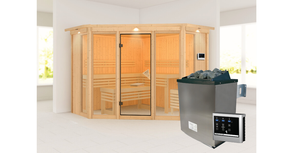 Karibu 68mm Systemsauna Alcinda mit Dachkranz + 9kW Saunaofen mit externer Steuerung