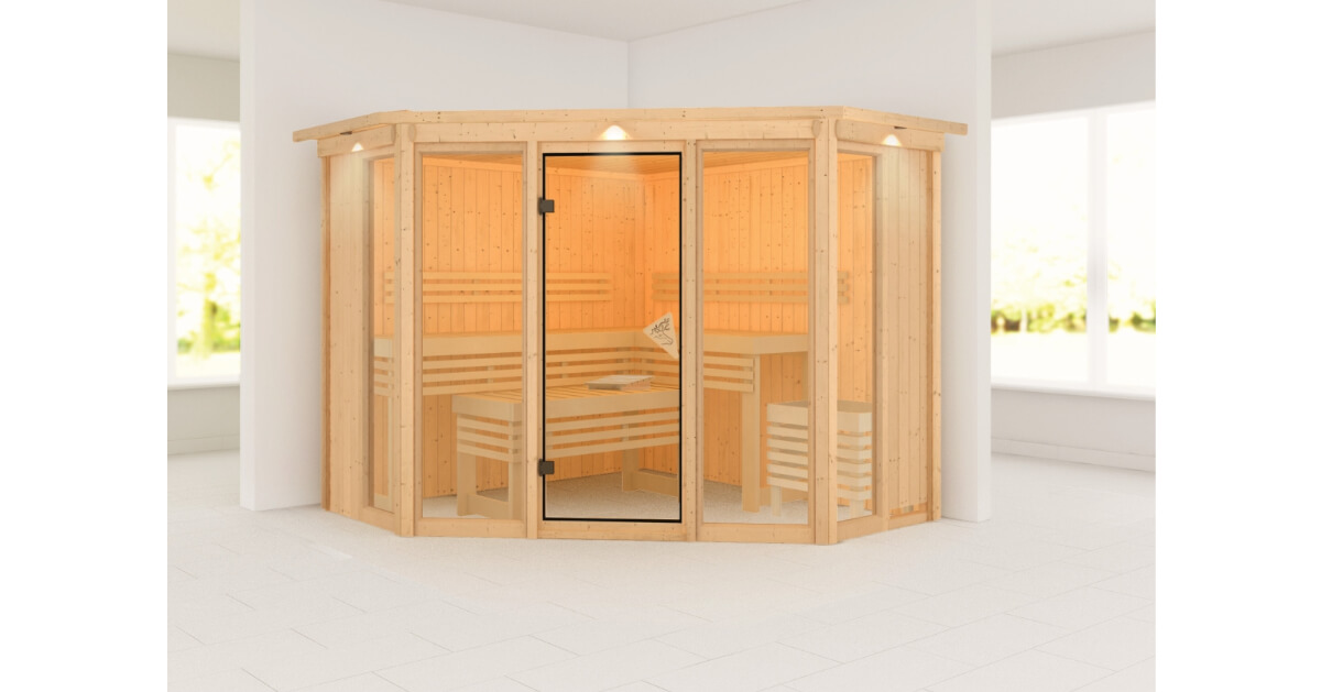Genau die Entspannung, die Sie sich wünschen. Ein heller und geräumiger Innenraum, der keine Wünsche offen lässt. Nutzen Sie die warme und beruhigende Saunaluft und stärken Sie Ihr Herz-Kreislauf-System. Fördern Sie die Durchblutung der Schleimhäute und fördern so die Heilung von Atemwegsinfekten. Mit der Systemsauna Alcinda tun Sie gleichzeitig etwas für Körper und Seele. Ausgestattet mit einem 9kW-Saunaofen, drei Saunaliegen aus weichem Espenholz, Bankblenden und Rückenlehnen, einem Ofenschutzgitter-Premium und einer Kopfstütze bringt die Sauna bereits alles mit, was Ihr Herz begehrt. Nach einem langen und harten Arbeitstag im Büro möchte sich jeder Entspannung und das so effektiv wie möglich. Dies gelingt nun kinderleicht mit einem ausgiebigen Saunabad. Im Nu sind Ihre Muskeln entspannt und der Alltagsstress vergessen. Mit den Außenmaßen 231 x 231 x 198 cm (B/T/H) ohne Dachkranz bietet die Sauna genug Platz für Sie und Ihre Liebsten. Genießen Sie die Möglichkeiten alleine oder mit der ganzen Familie. Die Saunabänke verfügen über eine Breite von 57 cm und ermöglichen so ein angenehmes Liegen während des Saunierens. Bei dem Ofen können Sie zwischen einem 9kW-Ofen mit integrierter Steuerung oder einem Ofen mit externerer Steuerung Easy wählen. Oder Sie entscheiden sich für einen 9kW-Bio-Kombiofen mit externer Steuerung Easy. Der Bio-Kombiofen verfügt, neben der klassischen finnischen Sauna, auch über eine Verdampfer-Einheit. Dies ermöglicht auch eine Kräuterdampf-Kur, ein Soft-Dampfbad-Feuchtwarm und eine Familiensauna. So ist garantiert für jeden das Richtige dabei. Ein echtes Highlight bieten die vier großzügigen Fenster in der Sauna. Diese lassen viel Tageslicht in das Innere und sorgen durch das bronzierte Glas für ein schönes Ambiente. Betreten können Sie die Sauna durch eine bronzierte Ganzglastür aus Einscheibensicherheitsglas mit Karibu-Türgriff. Die Wandelemente bestehen aus einer 68mm Rahmenkonstruktion mit Mineralwolldämmung und nordischen Fichtenbrettern. Machen Sie die Systemsauna unserer Superior-Reihe Alcinda zu Ihrem ganz persönlichen Highlight in Ihrer Wellness-Oase.