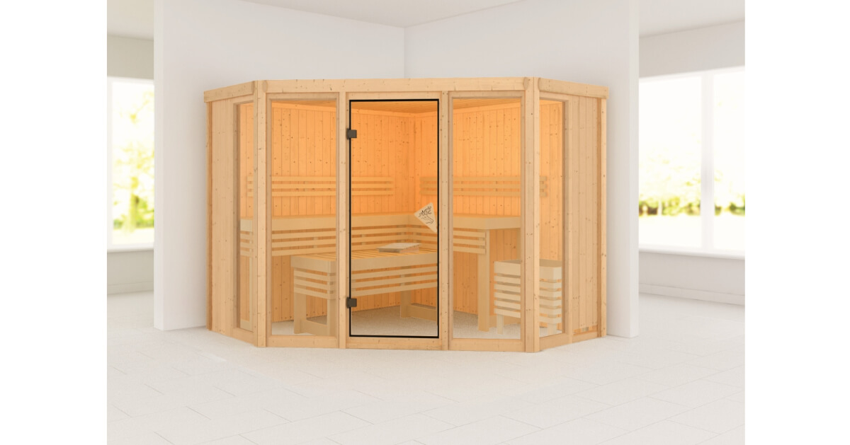 Genau die Entspannung, die Sie sich wünschen. Ein heller und geräumiger Innenraum, der keine Wünsche offen lässt. Nutzen Sie die warme und beruhigende Saunaluft und stärken Sie Ihr Herz-Kreislauf-System. Fördern Sie die Durchblutung der Schleimhäute und fördern so die Heilung von Atemwegsinfekten. Mit der Systemsauna Alcinda tun Sie gleichzeitig etwas für Körper und Seele. Ausgestattet mit einem 9kW-Saunaofen, drei Saunaliegen aus weichem Espenholz, Bankblenden und Rückenlehnen, einem Ofenschutzgitter-Premium und einer Kopfstütze bringt die Sauna bereits alles mit, was Ihr Herz begehrt. Nach einem langen und harten Arbeitstag im Büro möchte sich jeder Entspannung und das so effektiv wie möglich. Dies gelingt nun kinderleicht mit einem ausgiebigen Saunabad. Im Nu sind Ihre Muskeln entspannt und der Alltagsstress vergessen. Mit den Außenmaßen 231 x 231 x 198 cm (B/T/H) ohne Dachkranz bietet die Sauna genug Platz für Sie und Ihre Liebsten. Genießen Sie die Möglichkeiten alleine oder mit der ganzen Familie. Die Saunabänke verfügen über eine Breite von 57 cm und ermöglichen so ein angenehmes Liegen während des Saunierens. Bei dem Ofen können Sie zwischen einem 9kW-Ofen mit integrierter Steuerung oder einem Ofen mit externerer Steuerung Easy wählen. Oder Sie entscheiden sich für einen 9kW-Bio-Kombiofen mit externer Steuerung Easy. Der Bio-Kombiofen verfügt, neben der klassischen finnischen Sauna, auch über eine Verdampfer-Einheit. Dies ermöglicht auch eine Kräuterdampf-Kur, ein Soft-Dampfbad-Feuchtwarm und eine Familiensauna. So ist garantiert für jeden das Richtige dabei. Ein echtes Highlight bieten die vier großzügigen Fenster in der Sauna. Diese lassen viel Tageslicht in das Innere und sorgen durch das bronzierte Glas für ein schönes Ambiente. Betreten können Sie die Sauna durch eine bronzierte Ganzglastür aus Einscheibensicherheitsglas mit Karibu-Türgriff. Die Wandelemente bestehen aus einer 68mm Rahmenkonstruktion mit Mineralwolldämmung und nordischen Fichtenbrettern. Machen Sie die Systemsauna unserer Superior-Reihe Alcinda zu Ihrem ganz persönlichen Highlight in Ihrer Wellness-Oase.