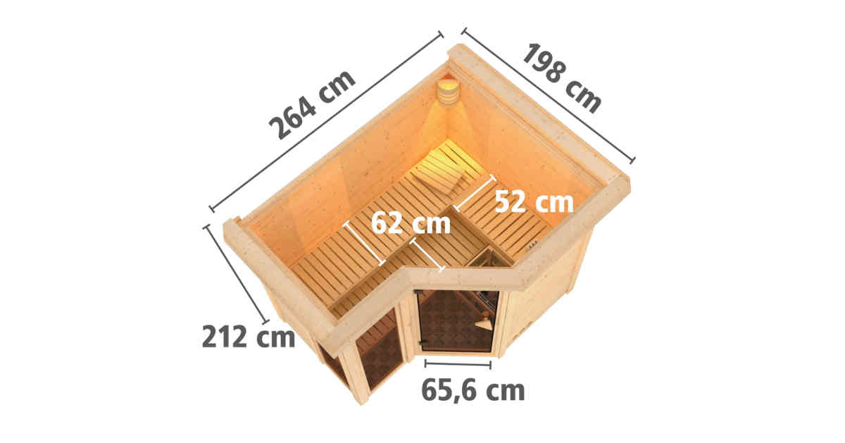 Ein Ort der Ruhe und Entspannung in den eigenen Vier Wänden. Nach einem stressigen Tag die Seele baumeln lassen und sich von der wohligen Wärme in einer Sauna verwöhnen ohne das Haus verlassen zu müssen. Dies ist möglich mit unserer 38mm Massivholzsauna Amara. Die stabile Konstruktion mit 38mm Bohlen aus nordischem Fichtenholz wird im einfachen Steck-/ Schraubsystem montiert. Durch die massiven Vollholzwände wird im Saunainneren ein ideales Raumklima nach finnischem Vorbild geschaffen. Ein optional wählbarer Dachkranz inkl. 3 LED-Spots setzt die Sauna gekonnt in Szene. Das Innere der Sauna erreichen Sie durch eine bronzierte Ganzglastür aus Einscheibensicherheitsglas mit Karibu-Türgriff. Durch die Tür und die beiden bronzierten Fenster gelangt Licht in den Innenraum und sorgt durch die bronzierten Gläser für ein warmes Ambiente. Mit einem Außenmaß von 236 x 184 x 209 cm (H/B/T) besitzt die Sauna Amara die ideale Größe zum Entspannen und Wohlfühlen. Erweitern Sie Ihre Möglichkeiten mit dem optional erhältlichen 9kW-Bio-Kombiofen. Neben einer klassischen finnischen Sauna haben Sie hier die Möglichkeit einer Kräuterdampf-Kur, einem Dampfbad und einer Familiensauna. So wird es zu einem Saunaerlebnis für die ganze Familie. Lassen Sie sich von der wohltuenden Wirkung des Saunabadens überzeugen. Bei regelmäßiger Anwendung fühlen Sie sich nicht nur deutlich entspannter. Zusätzlich wirkt es sich positiv auf den Stoffwechsel aus, verfeinert das Hautbild und unterstützt den Stressabbau. Um ein besonderes Sauna-Gefühl zu schaffen, wird die Sauna mit 3 Saunaliegen und einer Kopfstütze ausgestattet. Durch eine extra breite Saunaliege von 62cm Breite wird Ihnen ein besonders angenehmer Liegekomfort geboten. Ein Ofenschutzgitter schützt Sie vor Verbrennungen durch den Saunaofen. Mit einer optional erhältlichen Salzkristall Vital Sole oder der Salzkristall-Leuchte können Sie Ihre Atemwege befreien und wieder tief ein- und ausatmen. Genießen Sie die zahlreichen Vorteile des Saunieren und schaffe Sie einen Ort der Ruhe mit der MassivholzsaunaAmara.