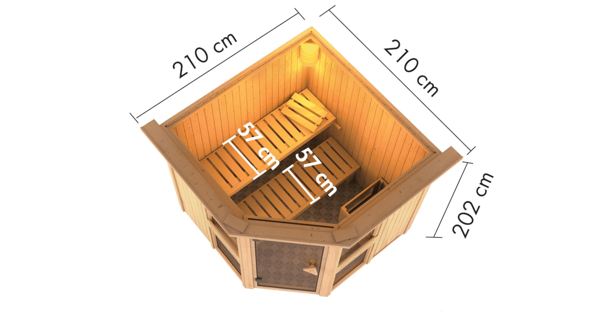 Diese Sauna vereint durchdachte Technik mit klarer Formensprache und schafft einen Ort, an dem sich Wärme, Ruhe und Design auf natürliche Weise verbinden. Mit ihren großzügigen Außenmaßen von 196 x 196 cm bietet sie ausreichend Platz für ausgedehnte Saunagänge – ob alleine, zu zweit oder als entspannter Wochenend-Rückzugsort mit der Familie. Der Eckeinstieg macht die Platzierung besonders flexibel und erlaubt es, die Sauna selbst in verwinkelten Räumen oder in durchdacht geplanten Wellnessbereichen optimal zu integrieren. Dank des spiegelbaren Aufbaus passt sie sich dabei mühelos an Ihre räumlichen Gegebenheiten an. Die 68 mm starke Wandkonstruktion in solider Elementbauweise sorgt für hohe Stabilität und eine lange Lebensdauer. Im Inneren der Wände unterstützt eine Mineralwolldämmung die gleichmäßige Wärmeverteilung und hält die Temperatur effizient auf konstantem Niveau – perfekt für entspannte, tiefe Saunagänge, bei denen man nicht nur körperlich, sondern auch mental abschalten kann. Ob nach einem aktiven Tag, als gesundes Ritual im Winter oder einfach, um sich einen Moment der Ruhe zu gönnen: Diese Sauna schafft dafür die ideale Umgebung. Ein gestalterisches Highlight ist die bronzierte Ganzglastür, die gemeinsam mit zwei seitlich platzierten bronzierten Fensterelementen die Front prägt. Die integrierten Blendapplikationen sorgen dabei für eine sanfte Lichtstreuung und schenken dem Innenraum eine geschützte, fast intime Atmosphäre. Das getönte Glas verleiht der Sauna eine warme, edle Optik und bewahrt zugleich die gewünschte Privatsphäre – ein harmonisches Zusammenspiel aus Transparenz und Geborgenheit. Im Inneren lädt das Interieur mit zwei komfortablen 57 cm tiefen Bänken aus Espe-Holz zum Sitzen, Liegen und Verweilen ein. Die helle, astarme Holzart bleibt auch bei höheren Temperaturen angenehm auf der Haut und sorgt für ein natürliches, beruhigendes Raumgefühl. Eine Kopfstütze aus Espe unterstützt zusätzlich eine entspannte Haltung. Das Ofenschutzgitter aus Fichte fügt sich optisch harmonisch in das Design ein und sorgt für Sicherheit – besonders dann, wenn auch Kinder mit saunieren oder Sie sich frei im Raum bewegen möchten. Wer dem Raum noch mehr Atmosphäre verleihen möchte, kann die Sauna mit einem optional erhältlichen Dachkranz mit integrierten LEDs ausstatten. Das indirekte Licht bringt die natürliche Maserung des Holzes besonders zur Geltung und taucht den Innenraum in eine stimmungsvolle, sanft leuchtende Kulisse – ideal für Abendstunden, an denen Sie die Sauna nicht nur als Wärmequelle, sondern als vollständigen Rückzugsort erleben möchten. Diese Sauna ist kein Standardprodukt, sondern ein Teil Ihrer persönlichen Auszeitkultur. Sie schenkt Ihnen regelmäßig Momente, in denen der Alltag draußen bleibt und der Fokus ganz auf dem Hier und Jetzt liegt – ein Ort zum Atmen, Aufwärmen, Entspannen. Ein Ort für Sie.