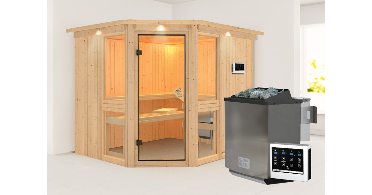 Karibu 68mm Systemsauna Amelia 3 mit Dachkranz + 9kW BIO-Kombiofen mit ext. Steuerung Easy