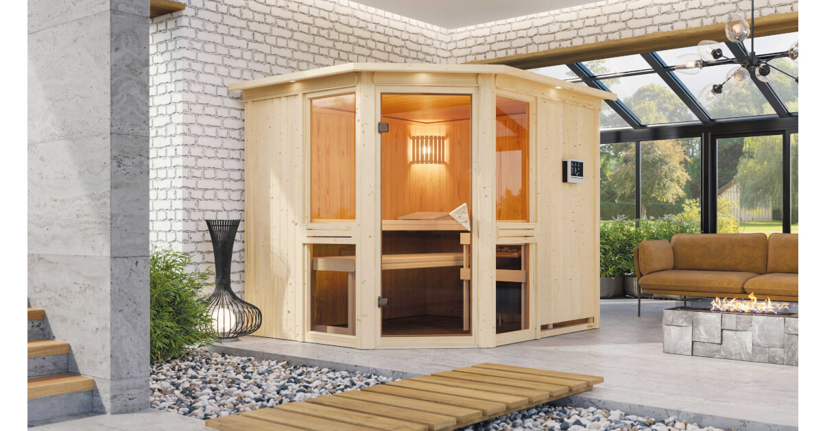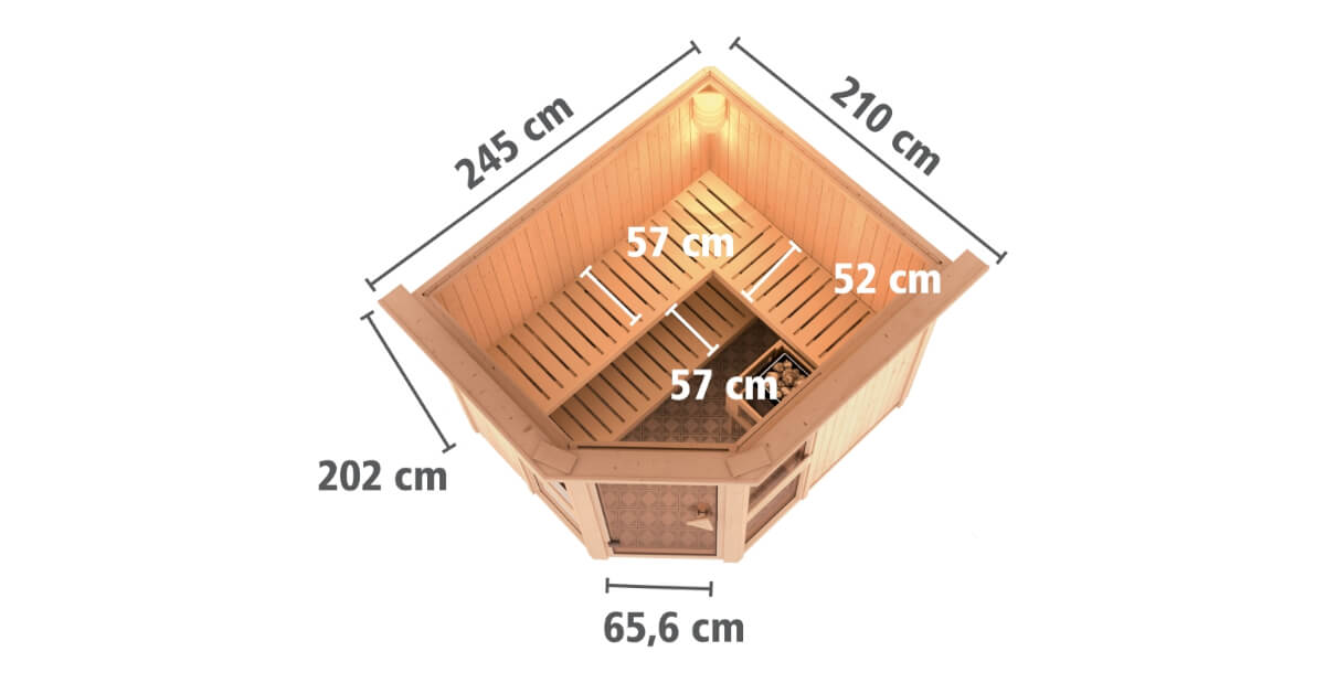 Großzügige, bronzierte Fenster inkl. einer Holzblende, 3 Saunabänke aus Espenholz und ein moderner Eckeinstieg machen das Saunaerlebnis mit der Systemsauna Amelia 3 perfekt .Eine 68mm starke Konstruktion, bestehend aus einer Rahmenkonstruktion mit 42mm starker Mineraldämmwolle und einer Verkleidung an der Sichtseite aus 12,5mm Spezial-Softline-Profilholz, hält die Wärme optimal im Saunainneren. Die Decke besteht aus einer 57mm starken Spezialplatte mit Mineraldämmwolle. Die Außenmaße betragen 231 x 196 x 198cm (B/T/H). Die Sauna lädt mit seiner hochwertigen Inneneinrichtung aus Espe zum Entspannen und Wohlfühlen ein. Mit einem optional erhältlichen 9kW-Saunaofen bringen Sie das Innere Ihrer Sauna schnell auf Temperatur. Bei dem Ofen können Sie zwischen einer Variante mit integrierter Steuerung, einer Variante mit externer Steuerung oder einem 9kW Bio-Kombi-Ofen wählen. So ist garantiert für jeden das Richtige dabei. Durch einen optionalen Dachkranz inkl. drei LED-Spots können Sie Ihre Sauna von außen beleuchten und sie so perfekt in Szene setzen. In den Innenraum gelangen Sie durch eine bronzierte Ganzglastür aus Einscheibensicherheitsglas mit Karibu-Türgriff. Um einen hellen Innenraum mit schönem Ambiente zu schaffen, verfügt die Sauna Amelia 3 über zwei großzügige bronzierte Fenster. Diese sorgen, neben einer warmen Atmosphäre im Innenraum, auch für ein echtes Highlight in Ihrer Wellness-Oase. Durch die vorgefertigten Wand und Deckenelemente wird Ihnen ein einfacher Aufbau ermöglicht. Passen Sie die Sauna auf Ihre Bedürfnisse an mit unserem optional erhältlichen Zubehör. Eine ergonomische Kopfstütze für den optimalen Liegekomfort, eine ergonomische Rückenlehne zur perfekten Entspannung oder eine Saunaleuchte modern für das richtige Licht im Inneren. Genießen Sie die Ruhe nach einem anstrengenden Arbeitstag bei einem ausgiebigen Saunagang und erholen Sie sich vom Alltag. Kreieren Sie sich Ihren eigenen Ort der Erholung und entspannen Sie vom Alltagsstress mit der Systemsauna.