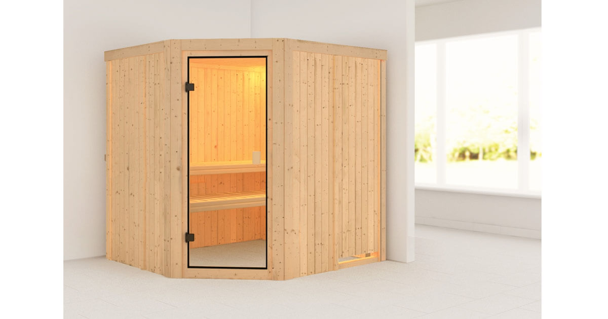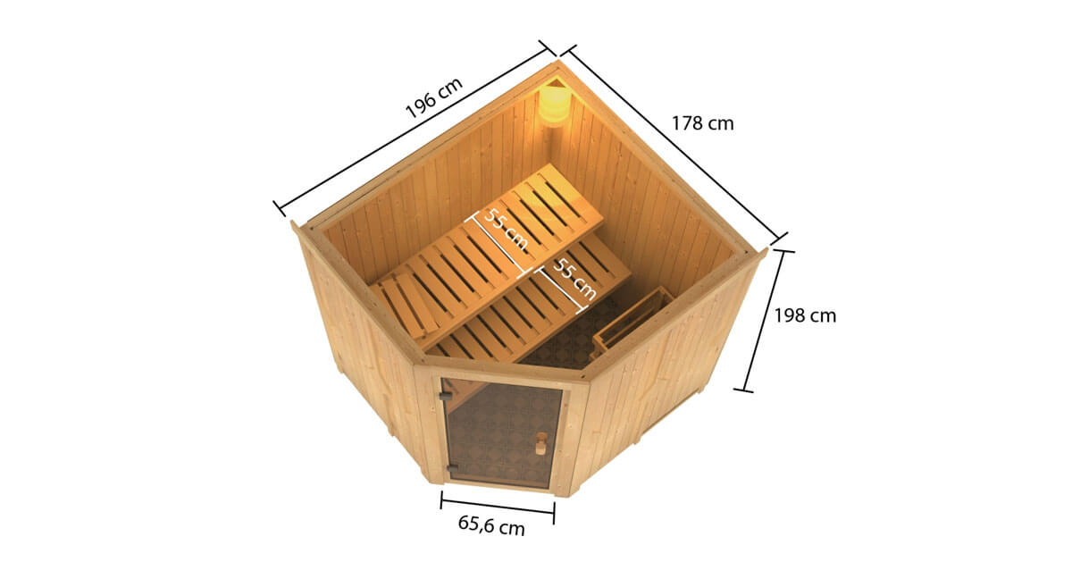 Sparen ohne Qualitätsverlust mit der System-Sauna Bodo aus 68mm nordischem Fichtenholz. Die Sauna wird mit der einfachen Elementbauweise montiert und ermöglicht so eine schnelle Montage. Mit einem Außenmaß von 196 x 178 x 198 cm (B/T/H) bietet dieses Saunamodell ausreichend Platz zum gemeinsamen Entspannen und Wohlfühlen. Für Sitz oder Liegemöglichkeiten in der Sauna sorgen die 2 Saunabänke aus nordischem Fichtenholz. Erweitern können Sie die Innenausstattung mit unserem optional erhältlichen Zubehör. Mit dem 3er-SET der Kopfstütze-Premium können Sie nicht nur Ihren Kopf optimal stützen. Durch zusammenschieben zweier Kopfstützen schaffen Sie sich eine Venenstütze für die Beine. Bei Problemen der Atemwege können Ihnen unsere Salzkristalle helfen. Durch anbringen einer Salzkristall-Leuchte oder einer Salzkristall Vital Sole schaffen Sie eine wertvolle, salzhaltige Luft während des Saunierens. Diese ermöglicht eine schonende und wirkungsvolle Behandlung der Atemwege und kann Entzündungen vorbeugen. Erwärmen können Sie die Luft im Saunainneren durch einen optional wählbaren 4,5kW-Saunaofen. Entscheiden Sie sich zwischen einem Ofen mit integrierter Steuerung, einem 4,5kW-Ofen mit externer Steuerung Easy oder unserem Alleskönner, dem 4,5kW Bio-Kombiofen. Mit diesem ist neben dem normalen finnischen Saunieren auch eine Dampfsauna möglich. So können Sie die Sauna ganz leicht auf Ihre Wünsche und Bedürfnisse ausstatten. Vor Verbrennungen am heißen Saunaofen schützt Sie das, im Lieferumfang enthaltene, Ofenschutzgitter. Durch eine bronzierte Ganzglastür aus Einscheibensicherheitsglas mit Magnetverschlusstechnik wird die Saunakabine verschlossen und das Entweichen der Wärme wird verhindert. Richten Sie sich Ihre Saunalandschaft ein, mit der Massivholz-Sauna Bodo und das zu einem fairen Preis ohne Qualitätsverlust.