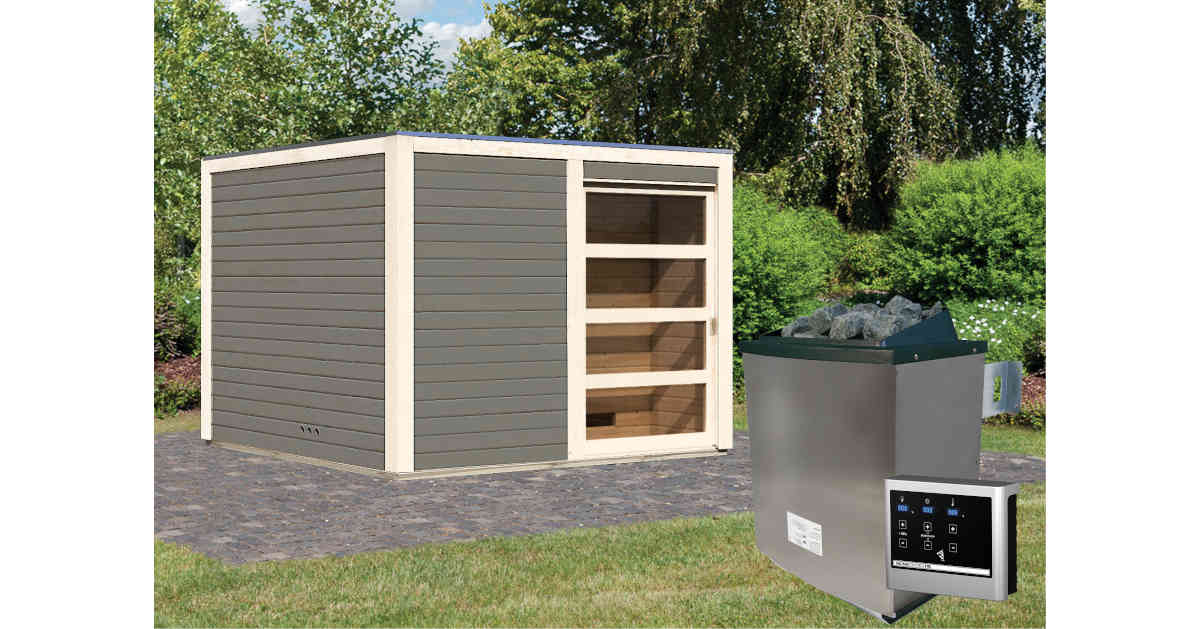 Karibu 38mm Saunahaus Cuben terragrau + 9 kW Saunaofen mit ext. Steuerung Easy
