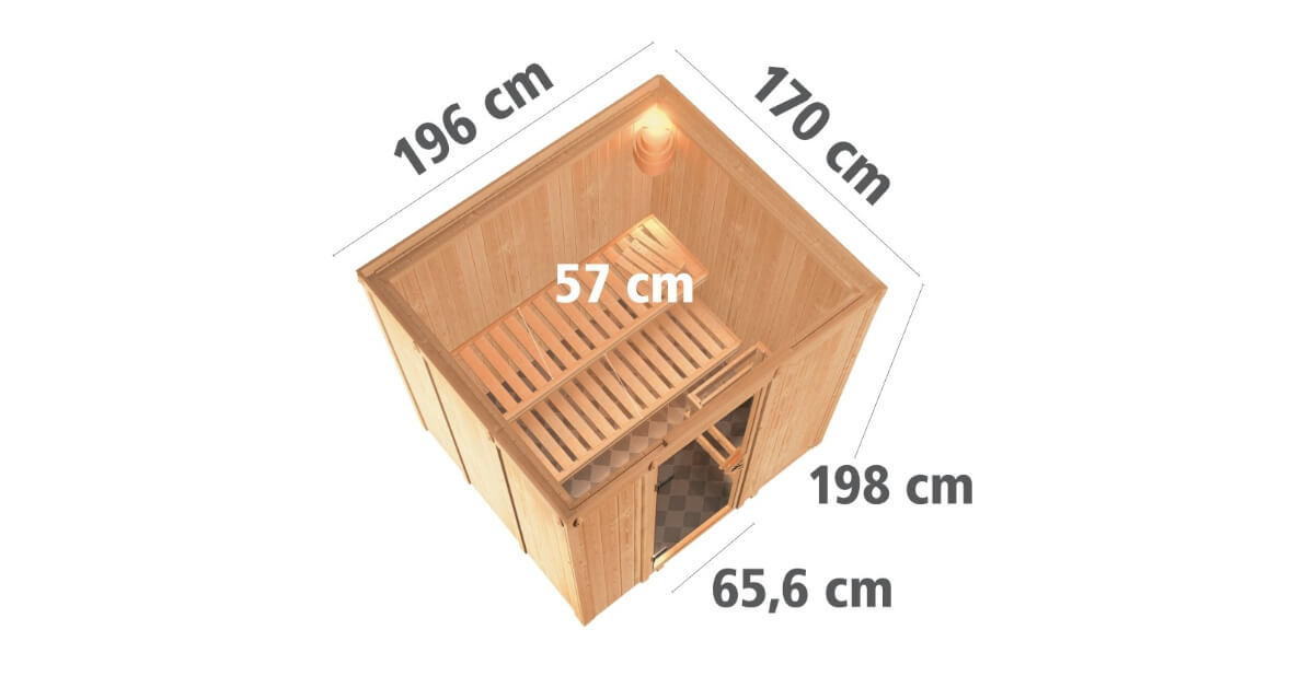 Das volle Saunaerlebnis genießen und dennoch Energie sparen. Dies ist möglich mit unserenr 68mm Systemsauna Daria und dem steckerfertigen 3,6kW-Saunaofen. Durch die vormontierten Wandelemente kann die Sauna schnell und einfach montiert werden. Die 68mm starken Elemente bestehen aus einer Rahmenkonstruktion, welche an der Sichtseite mit 12,5mm starkem Spezial-Softline-Profilholz verstärkt sind. Diese Konstruktion bietet eine ideale Isolierung und hält die Wärme perfekt im Innenraum. Optional ist die Sauna Daria mit einem Dachkranz inkl. drei LED-Spots erhältlich. Diese sorgen nicht nur für ein schönes Ambiente im Außenbereich der Sauna, sondern setzen diese auch noch gekonnt in Szene. Die Außenmaße betragen 196 x 170 x 198cm (B/T/H). In den großen Innenraum der Sauna gelangen Sie durch eine Saunatür. Hier haben Sie die Wahl aus vier Varianten und das ganz ohne Mehrkosten. Egal ob in der wärmegedämmten, energiesparenden Version, der klaren Ganzglastür, der Version mit bronzierte Ganzglastür oder der modernen graphitfarbenen Türversion. Hier ist garantiert für jeden Geschmack das Richtige dabei. Um sich im Saunainneren perfekt erholen zu können, wird hier1 Saunaliege aus massivem Espenholz montiert. Das Holz ist besonders weich und nimmt die Wärme nicht so stark an. Dies ermöglicht ein angenehmes Sitz- und Liegegefühl. Bei dem steckerfertigen Saunaofen können Sie zwischen drei Varianten wählen. Einer mit integrierter Steuerung, einer mit externem Steuergerät Easy und einem 3,6kW Bio-Kombi-Ofen. Das Besondere an diesem Saunaofen ist aber nicht seine Variantenvielfallt, sondern der Anschluss. Der Ofen wird mithilfe eines Steckers zur Inbetriebnahme an eine hausübliche 230Volt-Steckdose angeschlossen. Da hierfür kein Fachmann erforderlich ist, entfallen die Kosten für einen Elektriker und einen Umbau auf einen 400 Volt-Anschluss. Genießen Sie das volle Saunaerlebnis und sparen zusätzlich Energie mit der 68mm Plug & Play Sauna Daria.