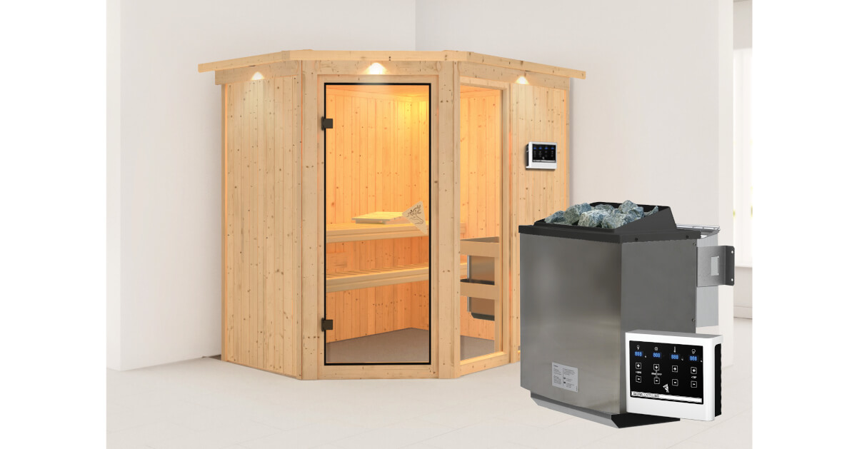 Karibu 68mm Systemsauna Fiona 1 mit Dachkranz + 9kW BIO-Kombiofen mit ext. Steuerung Easy