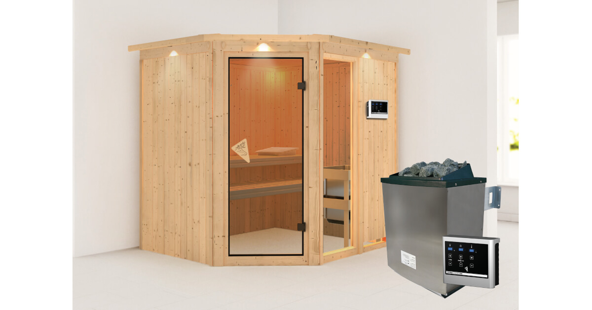 3 stabile Liegen aus Massivholz, 9kW Saunaofen mit externer Steuerung, Ofenschutzgitter, Montageanleitung