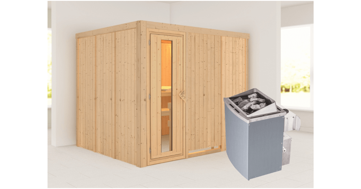 Karibu 68mm Systemsauna Gobin mit 9kW Saunaofen mit integrierter Steuerung