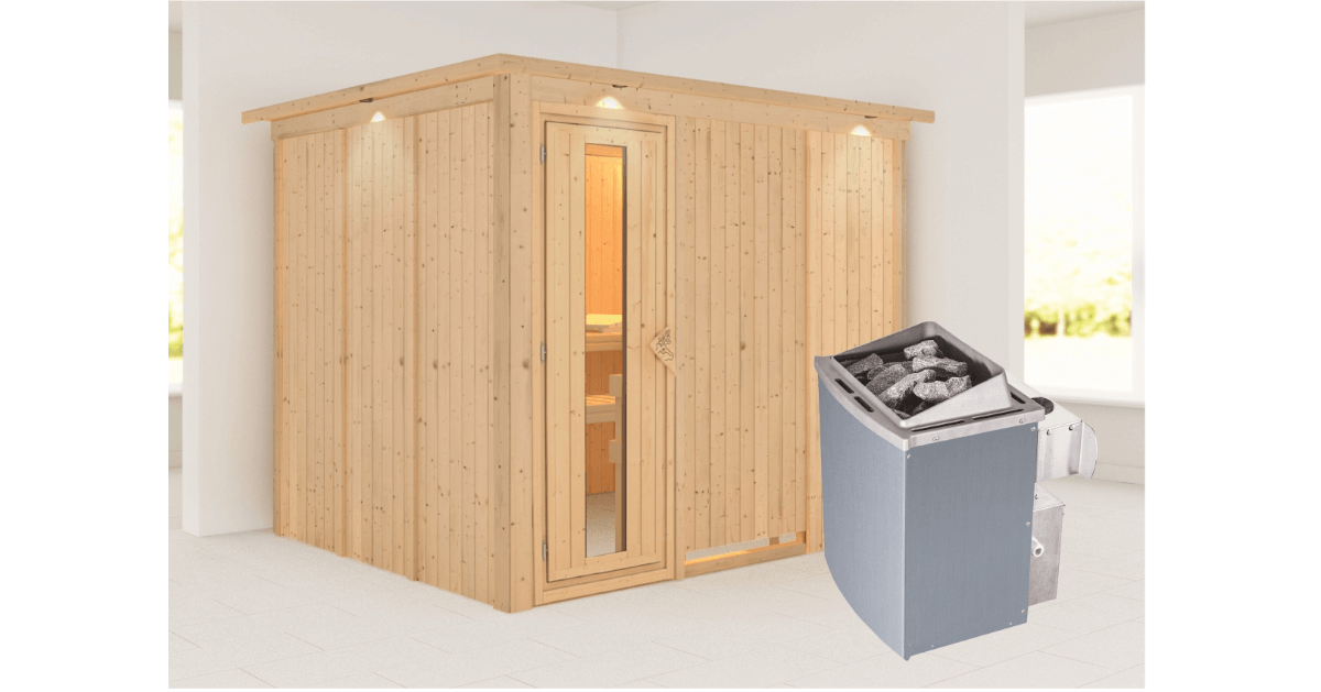 Karibu 68mm Systemsauna Gobin mit Dachkranz + 9kW Saunaofen mit integrierter Steuerung