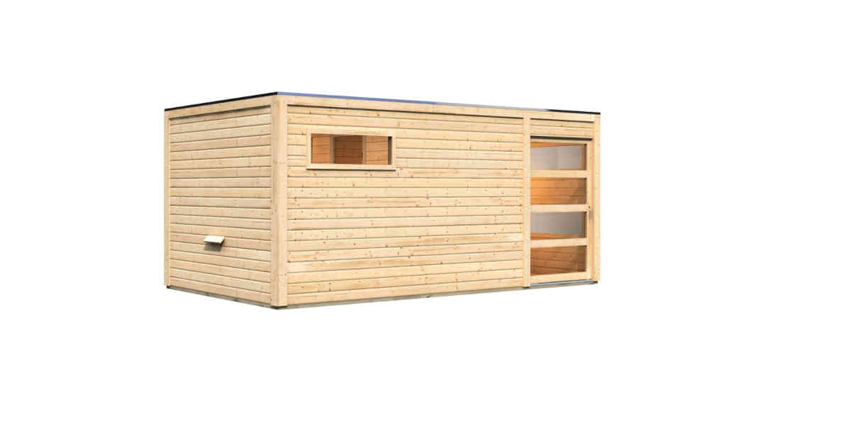 Das Massivholzdach schützt das Haus vor Nässe und wird inklusive einer selbstklebenden Dachfolie geliefert. Damit die Wärme im Saunabereich nicht entweichen kann, wird das Flachdach hier durch eine Rahmenkonstruktion mit 42mm Mineralvolldämmung und einer Verkleidung an der Sichtseite aus Spezial Softline Profilholz verstärkt. Durch Alu-Abschlusswinkel an der Dachkante werden unschöne Abschlüsse kaschiert und sorgen gleichzeitig für ein Highlight an der Außensauna. Durch drei Echtglasfenster zum Selbsteinbau gelangt Tageslicht in das Innere der Sauna und des Vorraums und schafft so im gesamten Saunahaus ein natürliches Ambiente.