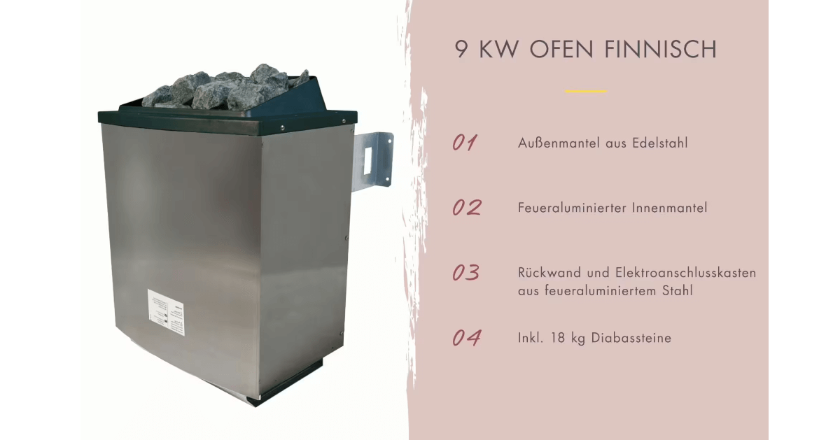 9 kW Ofen mit externer Steuerung und Steuergerät Easy, 2 stabile Liegen aus Massivholz, Montageanleitung