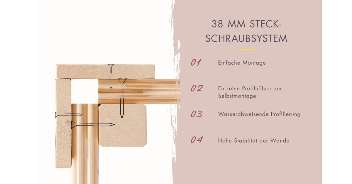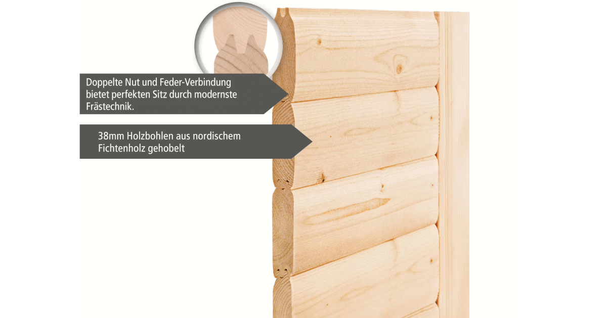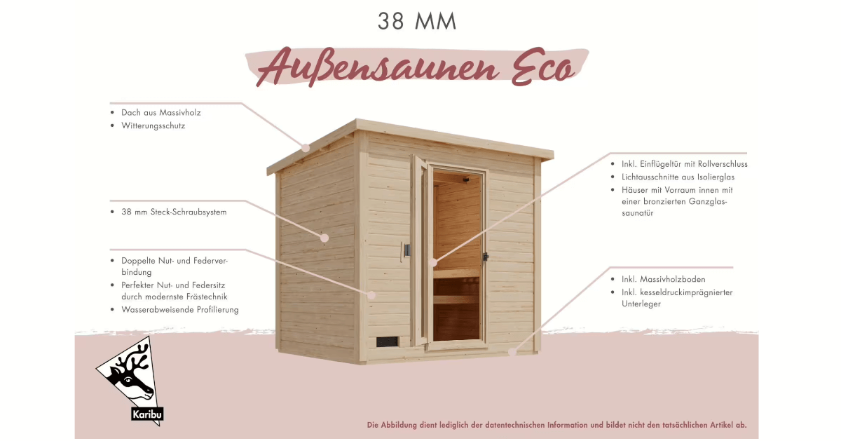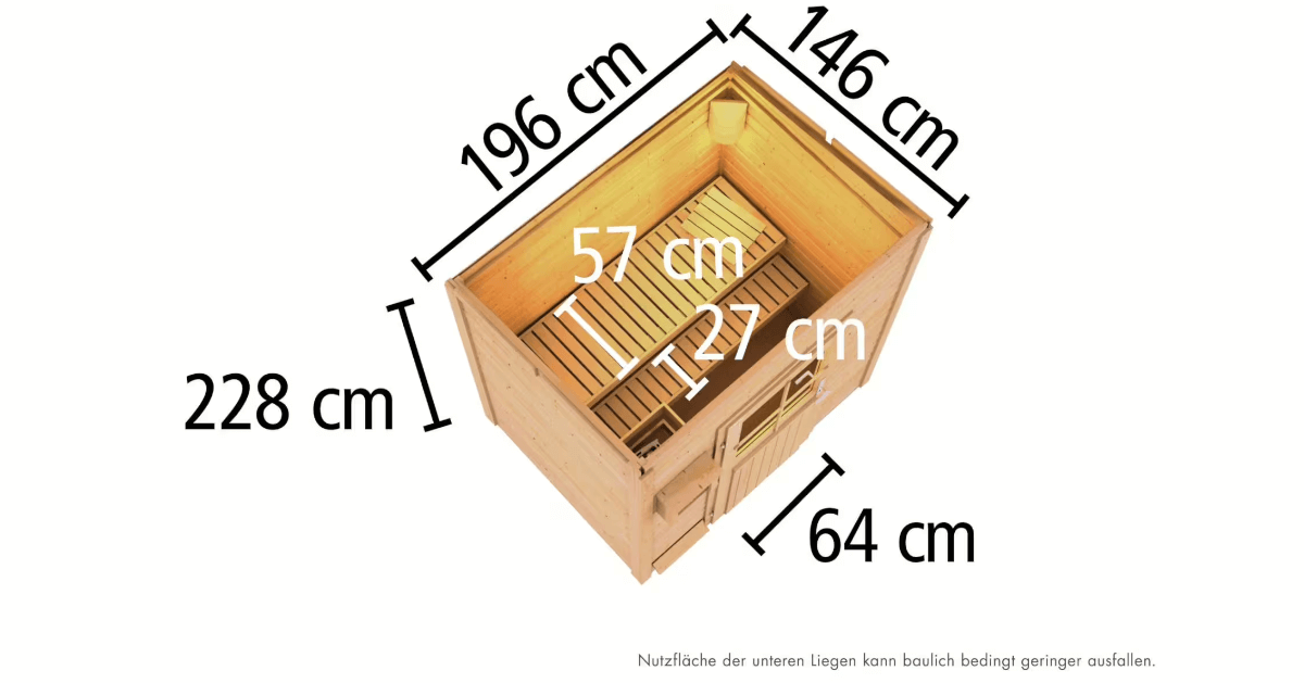 Willkommen im ultimativen Rückzugsort für Entspannung und Regeneration! Unser Saunahaus vereint Qualität, einfache Montage und maximale Bequemlichkeit für ein unvergleichliches Wellness-Erlebnis. Mit einer Wandstärke von 38 mm und einem innovativen Steck-Schraubsystem bietet unser Saunahaus nicht nur eine robuste Konstruktion, sondern auch eine unkomplizierte und schnelle Montage, damit Sie schneller den Saunagenuss auskosten können. Ein herausragendes Merkmal unseres Saunahauses sind die kesseldruckimprägnierten Unterleger, die eine lange Lebensdauer und optimale Stabilität gewährleistet. Diese spezielle Behandlung schützt das Holz vor Witterungseinflüssen und Feuchtigkeit, so dass Sie Ihre Sauna für viele Jahre ohne Sorgen genießen können. Die Vielseitigkeit unseres Saunahauses kennt keine Grenzen. Dank seiner kompakten Größe passt es problemlos auf einen Balkon, so dass Sie das volle Saunaerlebnis auch in urbanen Umgebungen genießen können, ohne über einen großen Garten oder ein geräumiges Badezimmer zu verfügen. Entspannen Sie sich und tanken Sie neue Energie in Ihrem eigenen kleinen Wellness-Paradies, direkt vor Ihrer Tür.
