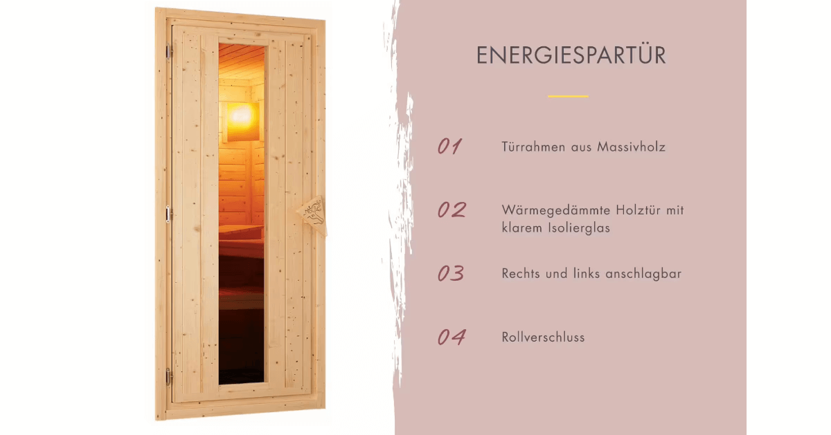 Der Einstieg in die Sauna wird durch eine Energiespartür inkl. Karibu Holzgriff ermöglicht.