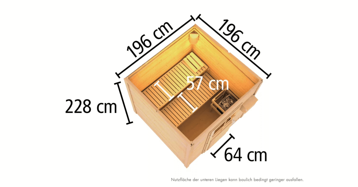 Willkommen im ultimativen Rückzugsort für Entspannung und Regeneration! Unser Saunahaus vereint Qualität, einfache Montage und maximale Bequemlichkeit für ein unvergleichliches Wellness-Erlebnis. Mit einer Wandstärke von 38 mm und einem innovativen Steck-Schraubsystem bietet unser Saunahaus nicht nur eine robuste Konstruktion, sondern auch eine unkomplizierte und schnelle Montage, damit Sie schneller den Saunagenuss auskosten können. Ein herausragendes Merkmal unseres Saunahauses sind die kesseldruckimprägnierten Unterleger, die eine lange Lebensdauer und optimale Stabilität gewährleistet. Diese spezielle Behandlung schützt das Holz vor Witterungseinflüssen und Feuchtigkeit, so dass Sie Ihre Sauna für viele Jahre ohne Sorgen genießen können. Die Vielseitigkeit unseres Saunahauses kennt keine Grenzen. Dank seiner kompakten Größe passt es problemlos auf einen Balkon, so dass Sie das volle Saunaerlebnis auch in urbanen Umgebungen genießen können, ohne über einen großen Garten oder ein geräumiges Badezimmer zu verfügen. Entspannen Sie sich und tanken Sie neue Energie in Ihrem eigenen kleinen Wellness-Paradies, direkt vor Ihrer Tür.