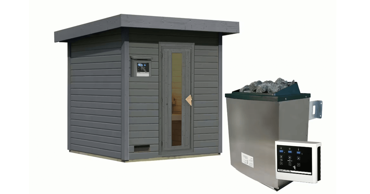 Karibu Sauna Hytti 2 terragrau mit 9 kW Ofen mit externer Steuerung