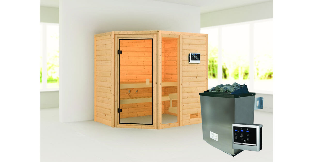 Karibu 38mm Massivholzsauna Jada + 9kW Saunaofen mit externer Steuerung