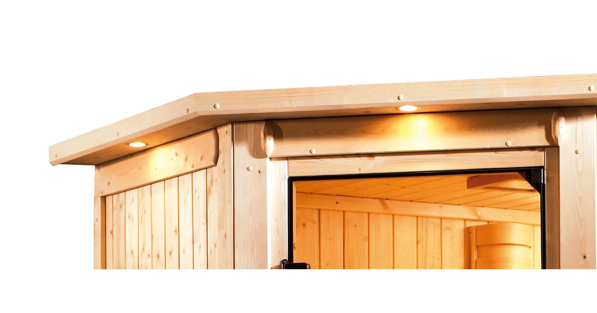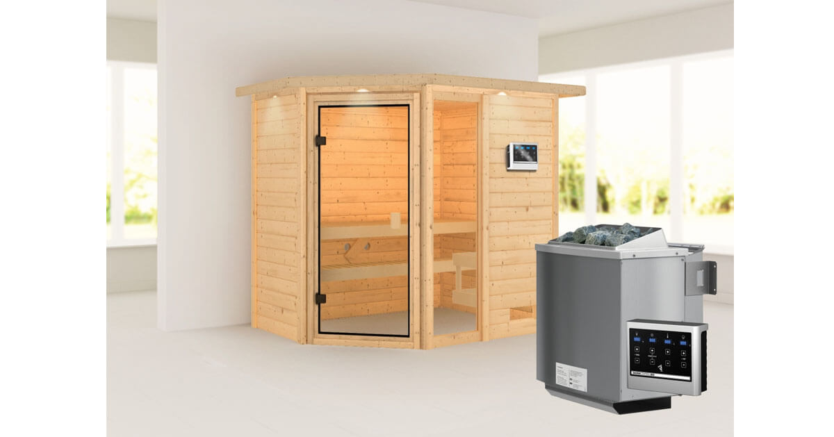 Karibu 38mm Massivholzsauna Jada mit Dachkranz + 9kW BIO-Kombiofen mit ext. Steuerung Easy