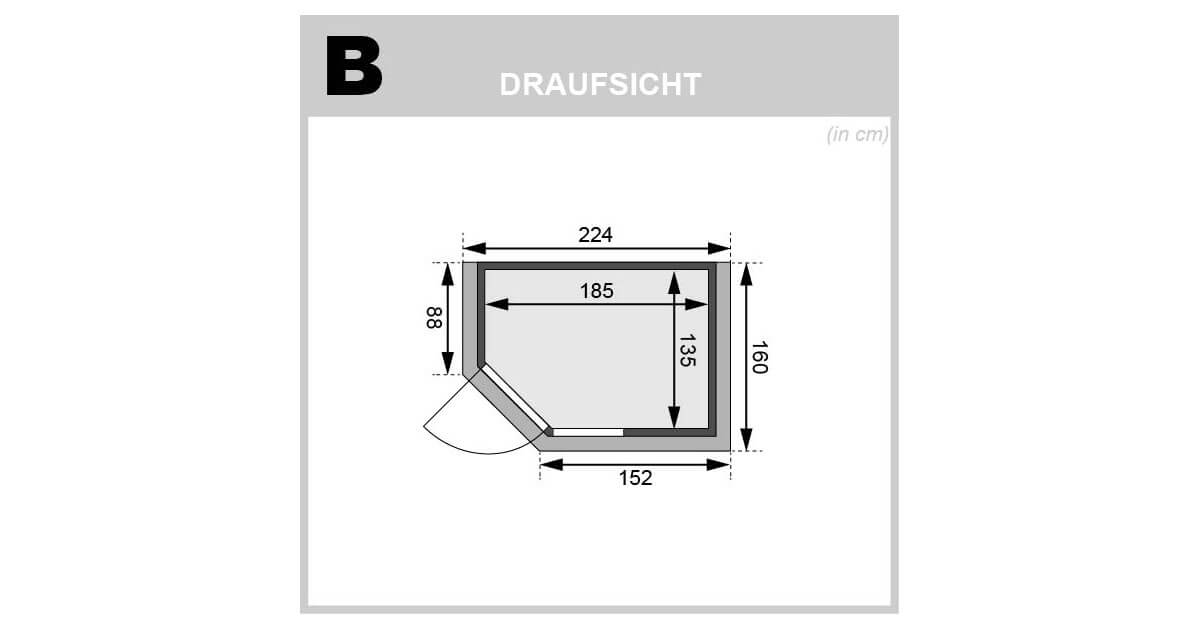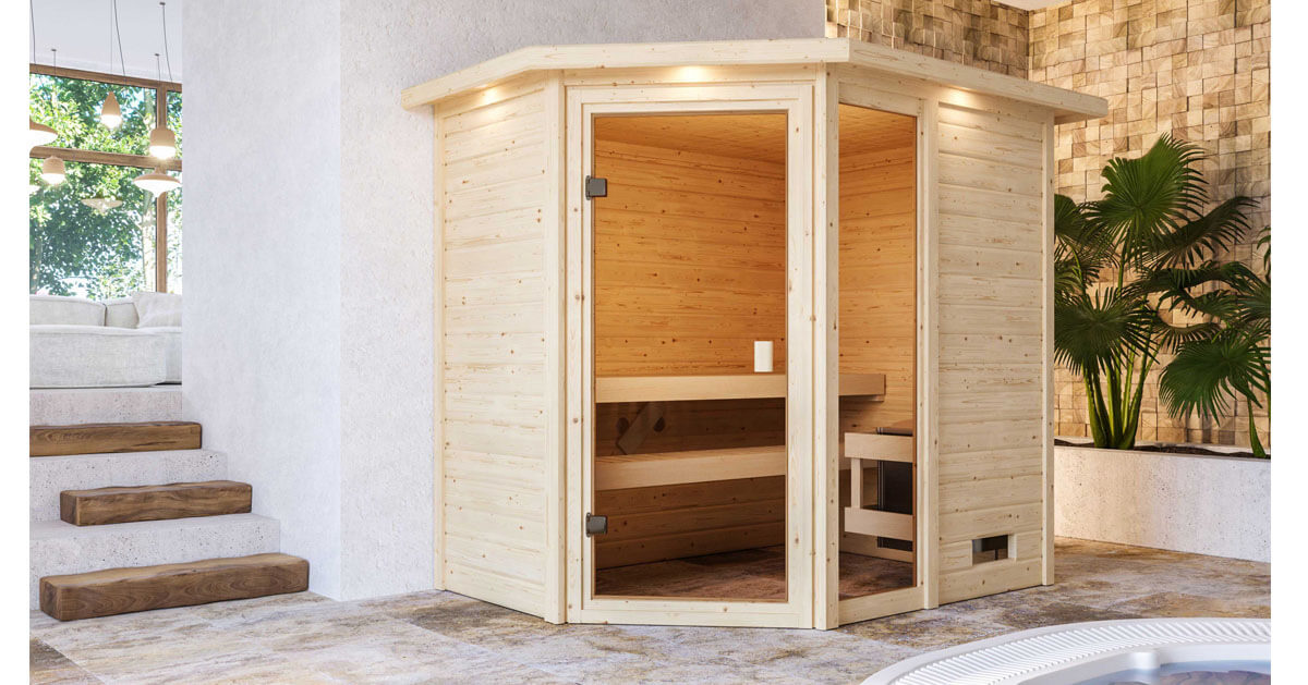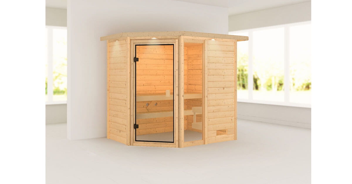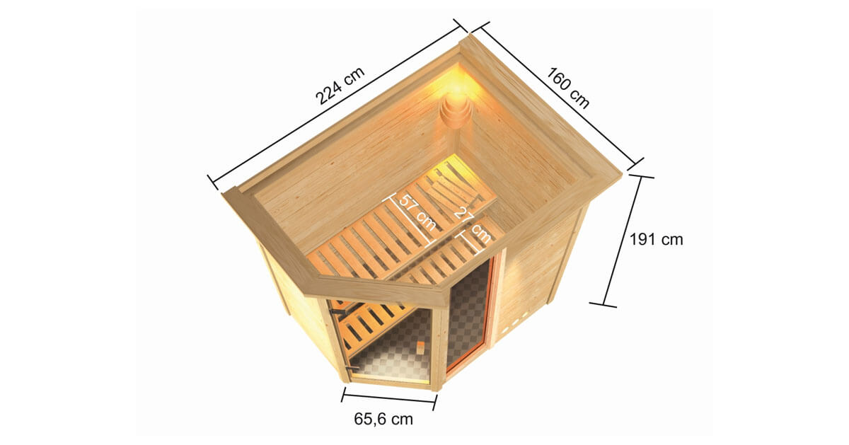 Was eignet sich für einen bislang ungenutzten Kellerraum besser, als eine eigene Sauna zum Entspannen und Wohlfühlen? Die Sauna Jada hat ein Außenmaß von 224 x 180 cm und ist, aufgrund seiner geringen Höhe von 191 cm, ideal auch für Räume mit einer niedrigen Deckenhöhe geeignet. Die Massivholzsauna besteht aus 38mm starken Wandbohlen aus nordischer Fichte, welche im einfachen Steck- und Schraubsystem montiert werden. Durch den Eckeinstieg und die besondere, fünfeckige Form, sorgt die Sauna für ein Highlight in Ihrer Wellness-Oase. Mit einem optional wählbaren Dachkranz inkl. 3 LED-Spots, können Sie die Sauna von außen beleuchten und sie so gekonnt in Szene setzen. In den Innenraum gelangen Sie durch eine bronzierte Ganzglastür aus Einscheibensicherheitsglas. Damit beim Saunieren keine Wärme entweichen kann, wird die Tür durch eine Magnetverschlusstechnik geschlossen gehalten. Auf den, im Lieferumfang enthaltenen, Liegen können Sie den Saunagang so richtig genießen. Verschönern Sie das Ambiente in Ihrer Sauna und sorgen Sie für die größtmögliche Erholung mit unserem optional erhältlichen Zubehör. Eine Saunalampe Classic in der Ecke, eine ergonomische Kopfstütze für die perfekte Liegeposition oder eine Salzkristall Vital Sole für freies Atmen macht Ihren Saunagang zu einem perfekten Erlebnis. Entspannen Sie nach einem stressigen Arbeitstag und schöpfen Sie neue Kraft aus der angenehmen Wärme auf Ihrer Haut. Heizen Sie den Innenraum mit einem optional erhältlichen, klassischen 9kW-Ofen. Dieser sorgt aufgrund seiner höheren Leistung für höhere Temperaturen und für ein angenehmes Klima im Innenraum. Der Saunaofen ist in einer Variante mit integrierter Steuerung, einer mit externer Steuerung und als Bio-Kombiofen erhältlich. Nutzen Sie Ihren Kellerraum zur Entspannung und verwandeln Sie ihn in eine Wellness-Oase mit der Massivholzsauna Sauna Jada.