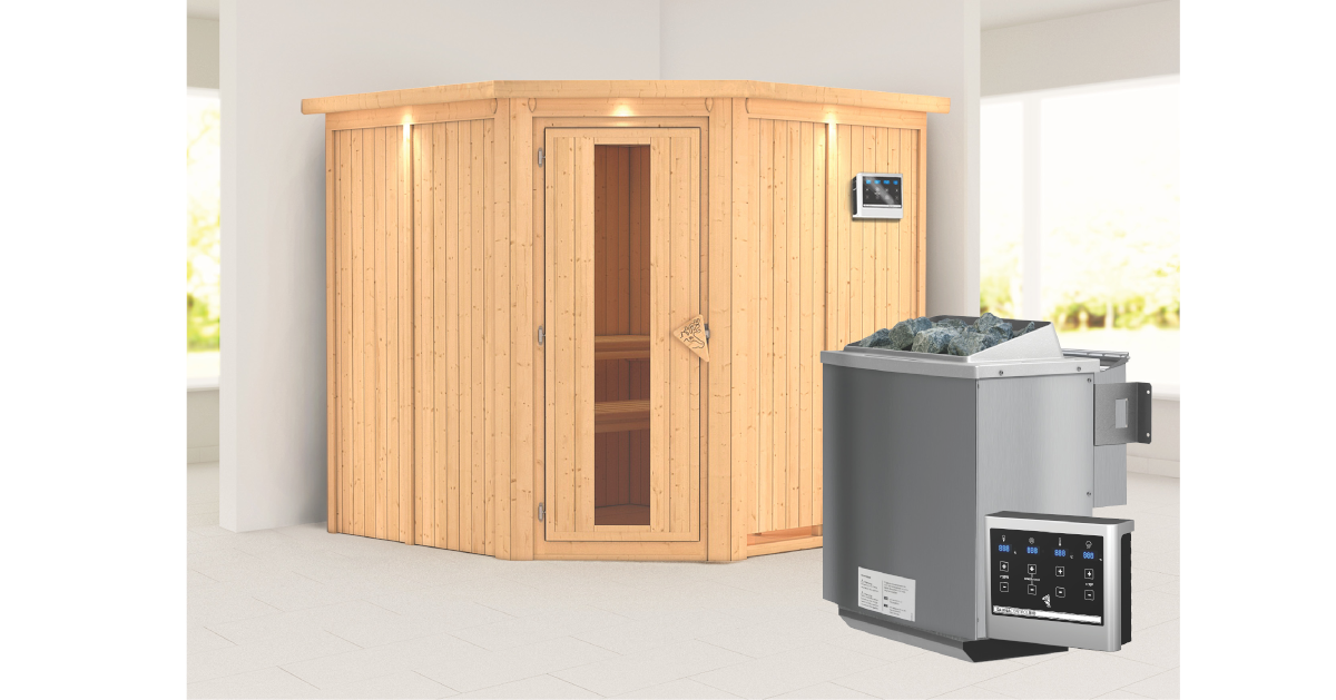 Karibu 68mm Systemsauna Jarin mit Dachkranz + 9kW BIO-Kombiofen mit ext. Steuerung Easy