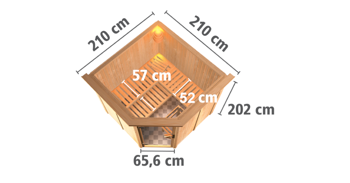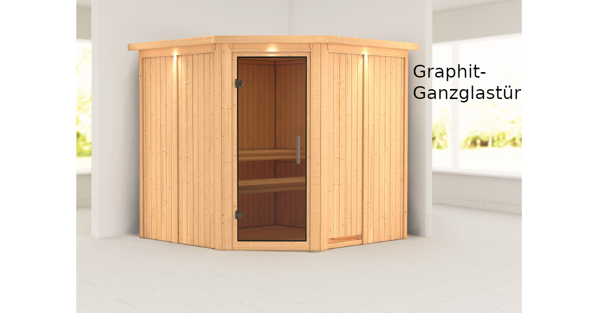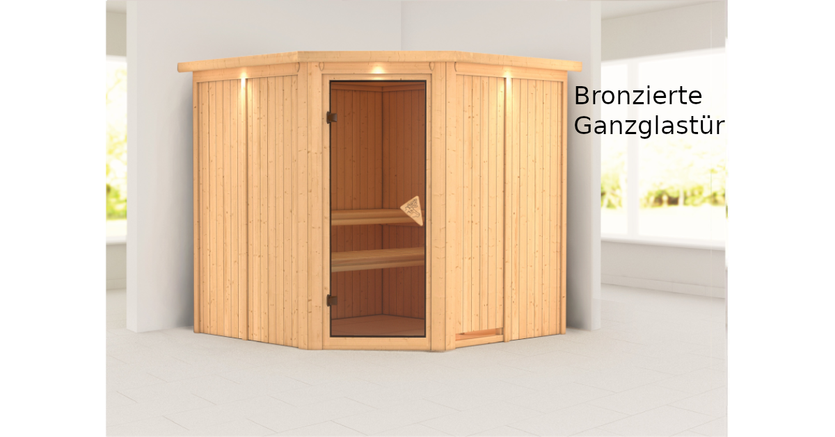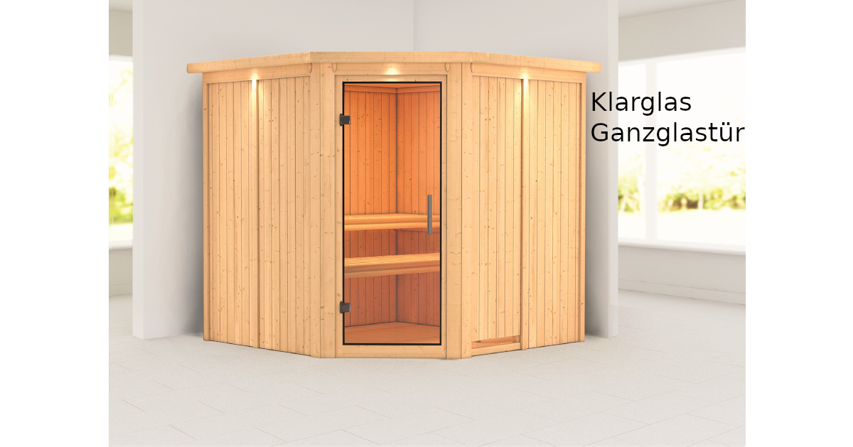 Sparen Sie wertvolle Energie mit der Systemsauna Jarin. Eine 68mm starke Konstruktion, bestehend aus einer Rahmenkonstruktion mit 42mm starker Mineraldämmwolle und einer Verkleidung an der Sichtseite aus 12,5mm Spezial-Softline-Profilholz, hält die Wärme optimal im Saunainneren. Die Decke besteht aus einer 57mm starken Spezialplatte mit Mineraldämmwolle. Die Außenmaße mit Dachkranz betragen 210 x 210 x 202 cm (B/T/H). Die Sauna verfügt über 3 Saunabänke aus Espenholz zum Entspannen und Wohlfühlen. Mit einem optional erhältlichen 9kW-Saunaofen bringen Sie das Innere schnell auf Temperatur. Bei dem Ofen können Sie zwischen einer Variante mit integrierter Steuerung, einer Variante mit externer Steuerung oder einem 9kW Bio-Kombiofen wählen. So ist garantiert für jeden das Richtige dabei. Durch einen optionalen Dachkranz inkl. drei LED-Spots können Sie Ihre Sauna von außen beleuchten und sie so perfekt in Szene setzen. In den Innenraum gelangen Sie durch eine Saunatür. Hier können Sie sich zwischen vier möglichen Varianten entscheiden. Egal ob klassisch mit bronziertem Glas, modern mit graphitfarbenem Glas, schlicht mit klarem Türglas oder passend mit einer energiesparenden, wärmegedämmten Holztür mit klarem Isolierglas. Durch die vorgefertigten Wand und Deckenelemente wird Ihnen ein einfacher Aufbau ermöglicht. Passen Sie die Sauna auf Ihre Bedürfnisse an mit unserem optional erhältlichen Zubehör. Eine ergonomische Kopfstütze für den optimalen Liegekomfort, eine ergonomische Rückenlehne zur perfekten Entspannung oder eine Saunaleuchte modern für das richtige Ambiente. Genießen Sie die Ruhe nach einem anstrengenden Arbeitstag bei einem ausgiebigen Saunagang und erholen Sie sich vom Alltag. Verringern Sie den Energieverbrauch beim Saunieren mit der 68mm Systemsauna Jarin.