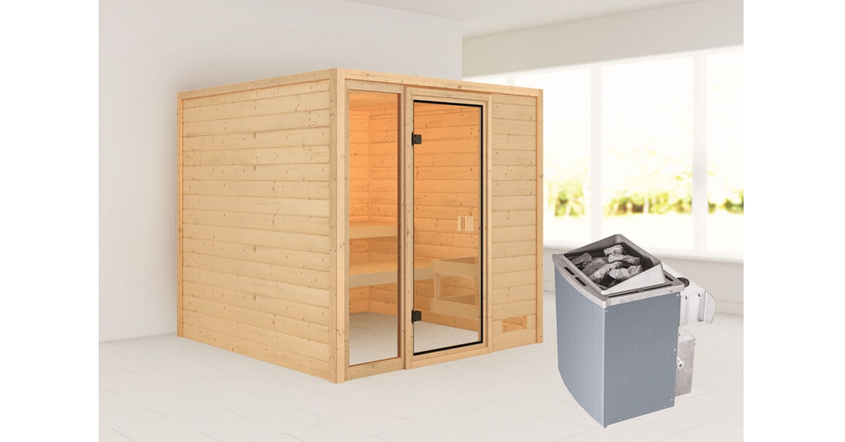 Karibu 38mm Massivholzsauna Jutta + 9kW Saunaofen mit integrierter Steuerung