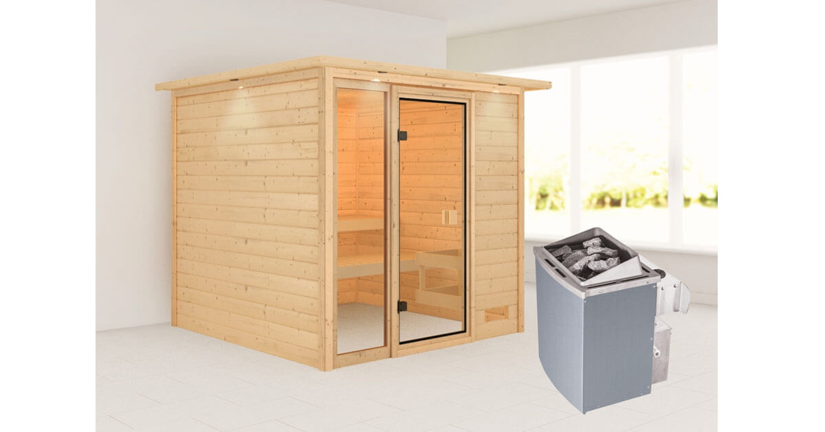 Karibu 38mm Massivholzsauna Jutta mit Dachkranz + 9kW Saunaofen mit integrierter Steuerung