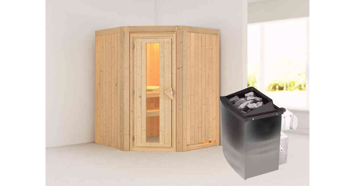 2 stabile Liegen aus Massivholz, 9kW Saunaofen mit integrierter Steuerung, Ofenschutzgitter, Montageanleitung