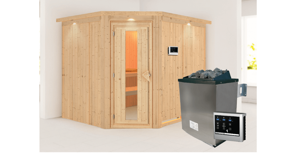 Karibu 68mm Systemsauna Malin mit Dachkranz + 9kW Saunaofen mit externer Steuerung