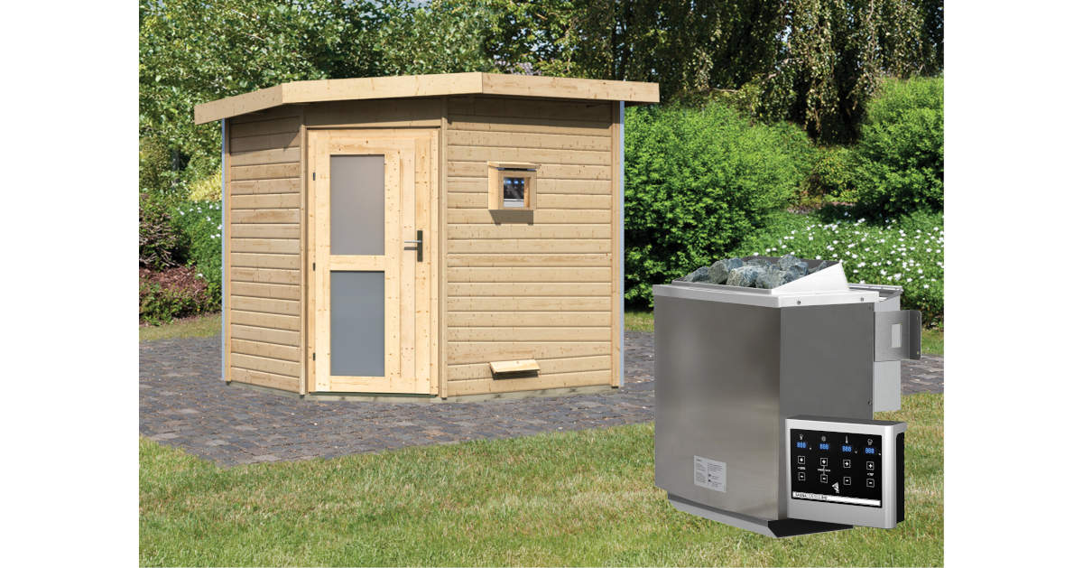 Karibu 38mm Saunahaus Mikka + 9 kW BIO-Kombiofen mit ext. Steuerung Easy