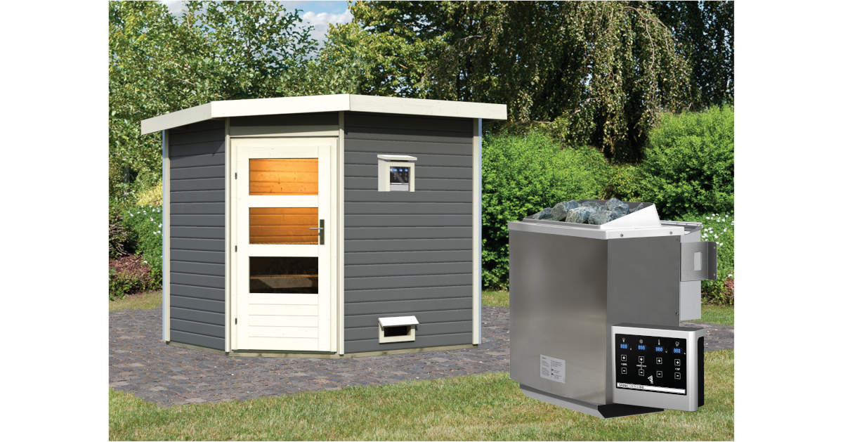 Karibu 38mm Saunahaus Mikka terragrau + 9 kW BIO-Kombiofen mit ext. Steuerung Easy
