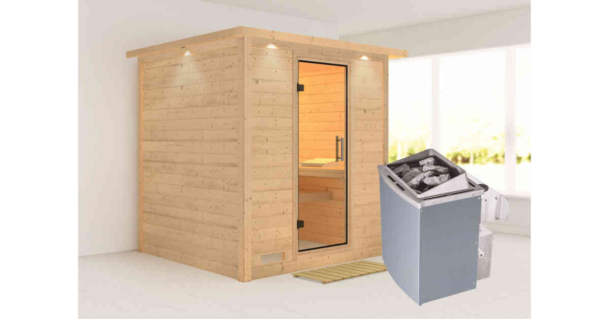 Karibu 40mm Systemsauna Mojave mit 9kW Saunaofen mit integrierter Steuerung