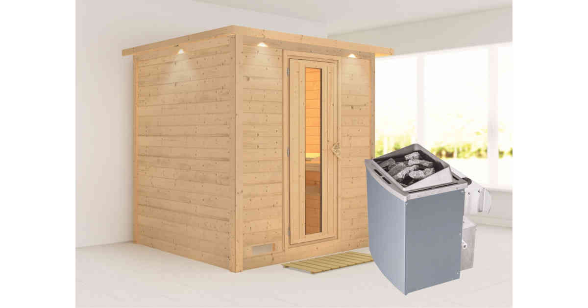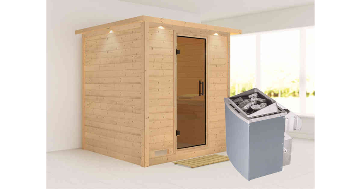 Ein Ort der Ruhe und Entspannung in den eigenen Vier Wänden. Nach einem stressigen Tag die Seele baumeln lassen und sich von der wohligen Wärme in einer Sauna verwöhnen ohne das Haus verlassen zu müssen. Dies ist möglich mit unserer 38 mm Massivholzsauna Mojave. Die stabile Konstruktion mit 38 mm Bohlen aus nordischem Fichtenholz wird im einfachen Steck-/ Schraubsystem montiert. Durch die massiven Vollholzwände wird im Saunainneren ein ideales Raumklima nach finnischem Vorbild geschaffen. Ein optional wählbarer Dachkranz inkl. 3 LED-Spots setzt die Sauna gekonnt in Szene. Wählen Sie eine von vier möglichen Türvarianten und passen Sie Ihre Sauna den eigenen Vorstellungen optimal an. Ob energiesparend mit einer Holztür mit Isolierglas, klassisch mit einer bronzierten Ganzglastür, modern mit einer Ganzglastür in graphitfarben oder schlicht mit einer klaren Ganzglastür. Hier ist garantiert das Richtige für Sie dabei. Mit einem Außenmaß von 196 x 196 x 200 cm (B/T/H) besitzt die Sauna Mojave die ideale Größe zum Entspannen und Wohlfühlen. Erweitern Sie Ihre Möglichkeiten mit dem optional erhältlichen 9kW-Bio-Kombiofen. Neben einer klassischen finnischen Sauna haben Sie hier die Möglichkeit einer Kräuterdampf-Kur, einem Dampfbad und einer Familiensauna. So wird es zu einem Saunaerlebnis für die ganze Familie. Lassen Sie sich von der wohltuenden Wirkung des Saunabadens überzeugen. Bei regelmäßiger Anwendung fühlen Sie sich nicht nur deutlich entspannter. Zusätzlich wirkt es sich positiv auf den Stoffwechsel aus, verfeinert das Hautbild und unterstützt den Stressabbau. Um ein besonderes Sauna-Gefühl zu schaffen, wird die Sauna mit Saunaliegen und einer Kopfstütze ausgestattet. Durch eine extra breite Saunaliege von 62cm Breite wird Ihnen ein besonders angenehmer Liegekomfort geboten. Ein Ofenschutzgitter schützt Sie vor Verbrennungen durch den Saunaofen. Mit einer optional erhältlichen Salzkristall Vital Sole oder der Salzkristall-Leuchte können Sie Ihre Atemwege befreien und wieder tief ein- und ausatmen. Genießen Sie die zahlreichen Vorteile des Saunieren und schaffe Sie einen Ort der Ruhe mit der Massivholzsauna Mojave.