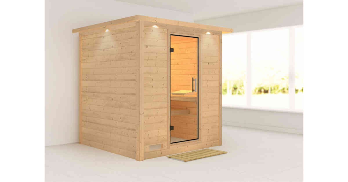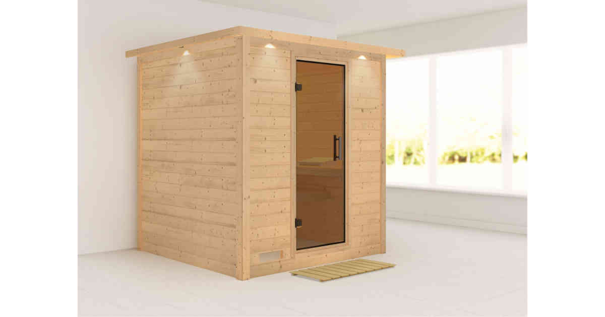 Ein Ort der Ruhe und Entspannung in den eigenen Vier Wänden. Nach einem stressigen Tag die Seele baumeln lassen und sich von der wohligen Wärme in einer Sauna verwöhnen ohne das Haus verlassen zu müssen. Dies ist möglich mit unserer 38 mm Massivholzsauna Mojave. Die stabile Konstruktion mit 38 mm Bohlen aus nordischem Fichtenholz wird im einfachen Steck-/ Schraubsystem montiert. Durch die massiven Vollholzwände wird im Saunainneren ein ideales Raumklima nach finnischem Vorbild geschaffen. Ein optional wählbarer Dachkranz inkl. 3 LED-Spots setzt die Sauna gekonnt in Szene. Wählen Sie eine von vier möglichen Türvarianten und passen Sie Ihre Sauna den eigenen Vorstellungen optimal an. Ob energiesparend mit einer Holztür mit Isolierglas, klassisch mit einer bronzierten Ganzglastür, modern mit einer Ganzglastür in graphitfarben oder schlicht mit einer klaren Ganzglastür. Hier ist garantiert das Richtige für Sie dabei. Mit einem Außenmaß von 196 x 196 x 200 cm (B/T/H) besitzt die Sauna Mojave die ideale Größe zum Entspannen und Wohlfühlen. Erweitern Sie Ihre Möglichkeiten mit dem optional erhältlichen 9kW-Bio-Kombiofen. Neben einer klassischen finnischen Sauna haben Sie hier die Möglichkeit einer Kräuterdampf-Kur, einem Dampfbad und einer Familiensauna. So wird es zu einem Saunaerlebnis für die ganze Familie. Lassen Sie sich von der wohltuenden Wirkung des Saunabadens überzeugen. Bei regelmäßiger Anwendung fühlen Sie sich nicht nur deutlich entspannter. Zusätzlich wirkt es sich positiv auf den Stoffwechsel aus, verfeinert das Hautbild und unterstützt den Stressabbau. Um ein besonderes Sauna-Gefühl zu schaffen, wird die Sauna mit Saunaliegen und einer Kopfstütze ausgestattet. Durch eine extra breite Saunaliege von 62cm Breite wird Ihnen ein besonders angenehmer Liegekomfort geboten. Ein Ofenschutzgitter schützt Sie vor Verbrennungen durch den Saunaofen. Mit einer optional erhältlichen Salzkristall Vital Sole oder der Salzkristall-Leuchte können Sie Ihre Atemwege befreien und wieder tief ein- und ausatmen. Genießen Sie die zahlreichen Vorteile des Saunieren und schaffe Sie einen Ort der Ruhe mit der Massivholzsauna Mojave.