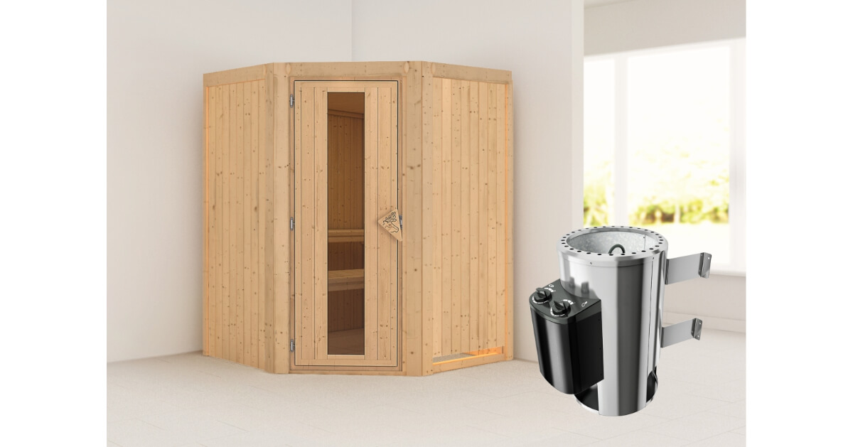 Karibu 40mm Systemsauna Minja mit 3,6kW Saunaofen mit integrierter Steuerung