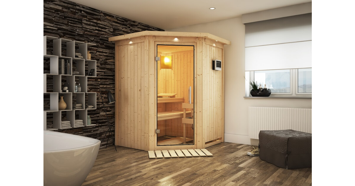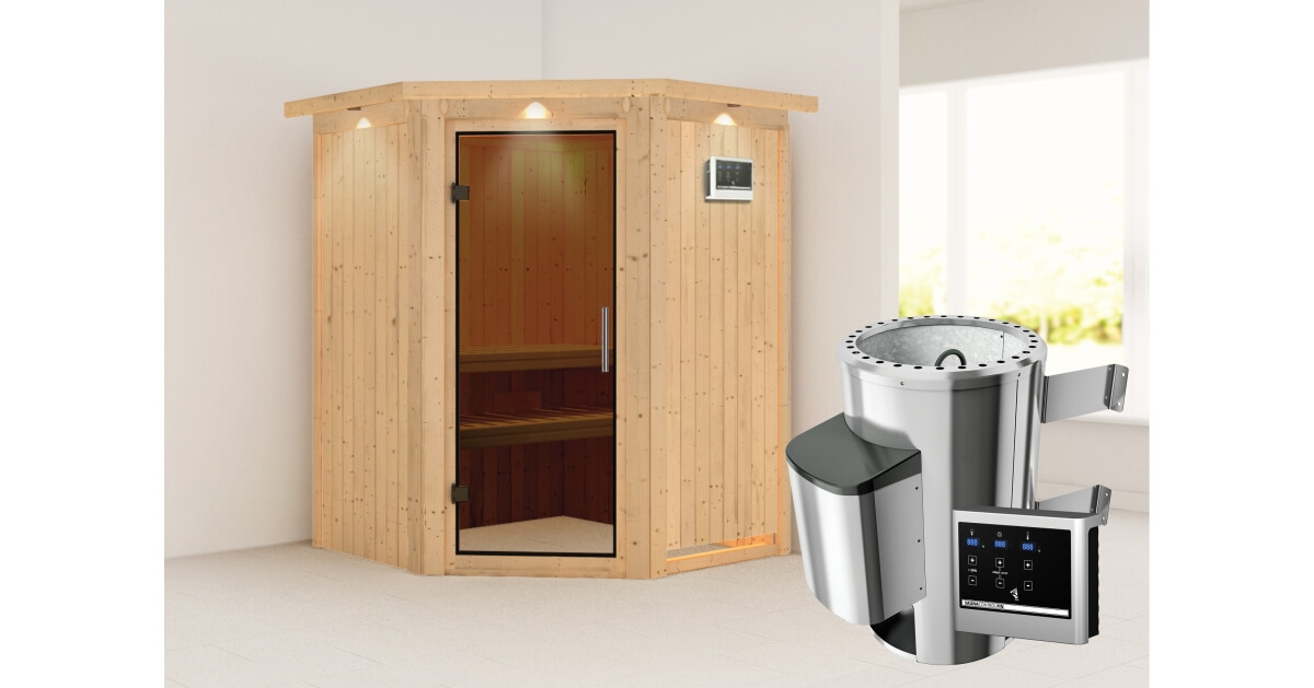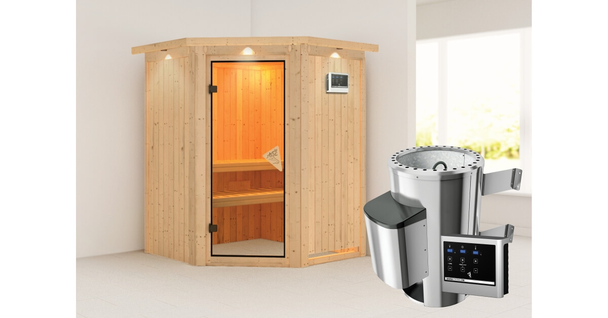Karibu 68mm Systemsauna Nanja mit 3,6kW Saunaofen mit ext. Steuerung Easy