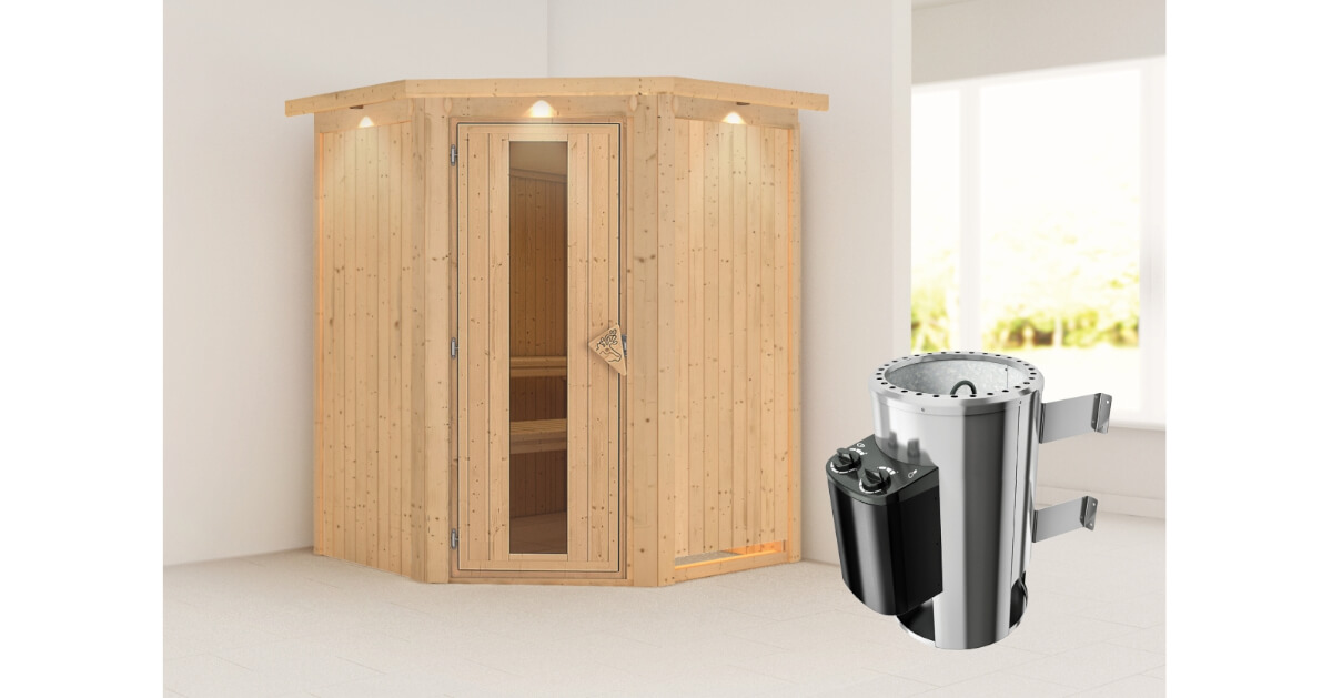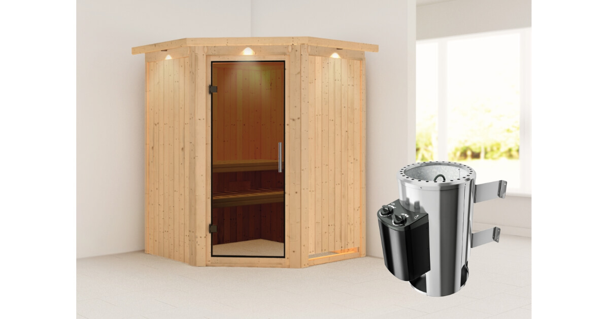 Karibu 68mm Systemsauna Nanja mit 3,6kW Saunaofen mit integrierter Steuerung