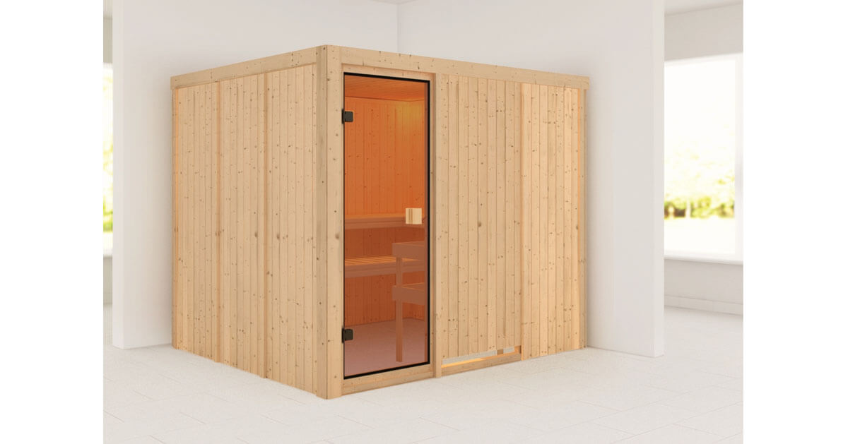 Sparen ohne Qualitätsverlust mit der System-Sauna Nybro aus 68mm nordischem Fichtenholz. Die Sauna wird mit der einfachen Elementbauweise montiert und ermöglicht so eine schnelle Montage. Mit einem Außenmaß von 231 x 196 x 198 cm (B/T/H) bietet dieses Saunamodell ausreichend Platz zum gemeinsamen Entspannen und Wohlfühlen. Für Sitz oder Liegemöglichkeiten in der Sauna sorgen die 3 Saunabänke aus nordischem Fichtenholz. Erweitern können Sie die Innenausstattung mit unserem optional erhältlichen Zubehör. Mit dem 3er-SET der Kopfstütze-Premium können Sie nicht nur Ihren Kopf optimal stützen. Durch zusammenschieben zweier Kopfstützen schaffen Sie sich eine Venenstütze für die Beine. Bei Problemen der Atemwege können Ihnen unsere Salzkristalle helfen. Durch anbringen einer Salzkristall-Leuchte oder einer Salzkristall Vital Sole schaffen Sie eine wertvolle, salzhaltige Luft während des Saunierens. Diese ermöglicht eine schonende und wirkungsvolle Behandlung der Atemwege und kann Entzündungen vorbeugen. Erwärmen können Sie die Luft im Saunainneren durch einen optional wählbaren 9kW-Saunaofen. Entscheiden Sie sich zwischen einem Ofen mit integrierter Steuerung, einem 9kW-Ofen mit externer Steuerung Easy oder unserem Alleskönner, dem 9kW Bio-Kombiofen. Mit diesem ist neben dem normalen finnischen Saunieren auch eine Dampfsauna möglich. So können Sie die Sauna ganz leicht auf Ihre Wünsche und Bedürfnisse ausstatten. Vor Verbrennungen am heißen Saunaofen schützt Sie das, im Lieferumfang enthaltene, Ofenschutzgitter. Durch eine bronzierte Ganzglastür aus Einscheibensicherheitsglas mit Magnetverschlusstechnik wird die Saunakabine verschlossen und das Entweichen der Wärme wird verhindert. Richten Sie sich Ihre Saunalandschaft ein, mit der Massivholz-Sauna Nybro und das zu einem fairen Preis ohne Qualitätsverlust.