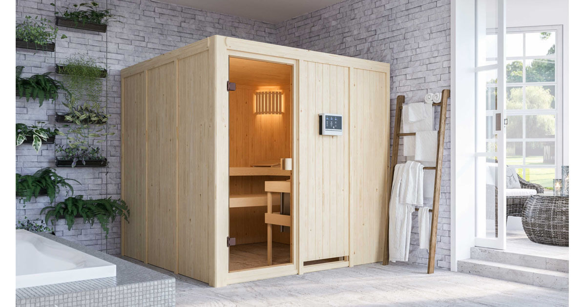 Sparen ohne Qualitätsverlust mit der System-Sauna Oulu aus 68mm nordischem Fichtenholz. Die Sauna wird mit der einfachen Elementbauweise montiert und ermöglicht so eine schnelle Montage. Mit einem Außenmaß von 196 x 196 x 198 cm (B/T/H) bietet dieses Saunamodell ausreichend Platz zum gemeinsamen Entspannen und Wohlfühlen. Für Sitz oder Liegemöglichkeiten in der Sauna sorgen die 3 Saunabänke aus nordischem Fichtenholz. Erweitern können Sie die Innenausstattung mit unserem optional erhältlichen Zubehör. Mit dem 3er-SET der Kopfstütze-Premium können Sie nicht nur Ihren Kopf optimal stützen. Durch zusammenschieben zweier Kopfstützen schaffen Sie sich eine Venenstütze für die Beine. Bei Problemen der Atemwege können Ihnen unsere Salzkristalle helfen. Durch anbringen einer Salzkristall-Leuchte oder einer Salzkristall Vital Sole schaffen Sie eine wertvolle, salzhaltige Luft während des Saunierens. Diese ermöglicht eine schonende und wirkungsvolle Behandlung der Atemwege und kann Entzündungen vorbeugen. Erwärmen können Sie die Luft im Saunainneren durch einen optional wählbaren 9kW-Saunaofen. Entscheiden Sie sich zwischen einem Ofen mit integrierter Steuerung, einem 9kW-Ofen mit externer Steuerung Easy oder unserem Alleskönner, dem 9kW Bio-Kombiofen. Mit diesem ist neben dem normalen finnischen Saunieren auch eine Dampfsauna möglich. So können Sie die Sauna ganz leicht auf Ihre Wünsche und Bedürfnisse ausstatten. Vor Verbrennungen am heißen Saunaofen schützt Sie das, im Lieferumfang enthaltene, Ofenschutzgitter. Durch eine bronzierte Ganzglastür aus Einscheibensicherheitsglas mit Magnetverschlusstechnik wird die Saunakabine verschlossen und das Entweichen der Wärme wird verhindert. Richten Sie sich Ihre Saunalandschaft ein, mit der Massivholz-Sauna Oulu und das zu einem fairen Preis ohne Qualitätsverlust.