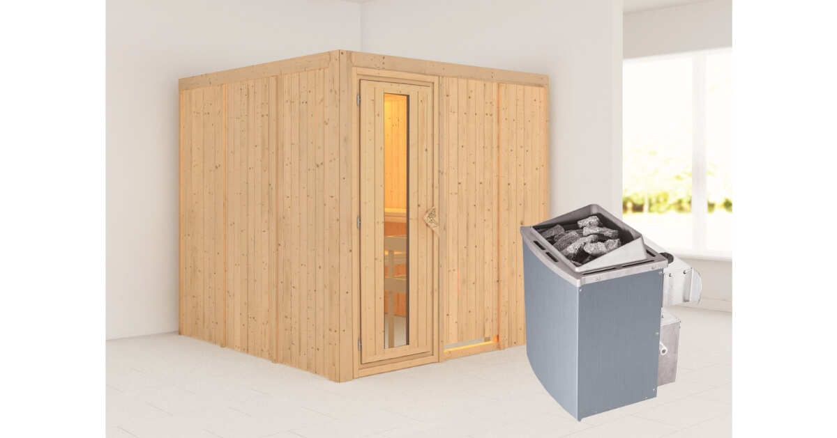 3 stabile Liegen aus Massivholz, 9kW Saunaofen mit integrierter Steuerung, Ofenschutzgitter, Montageanleitung