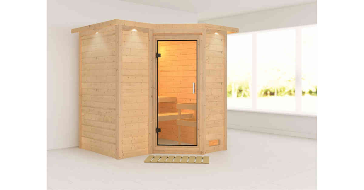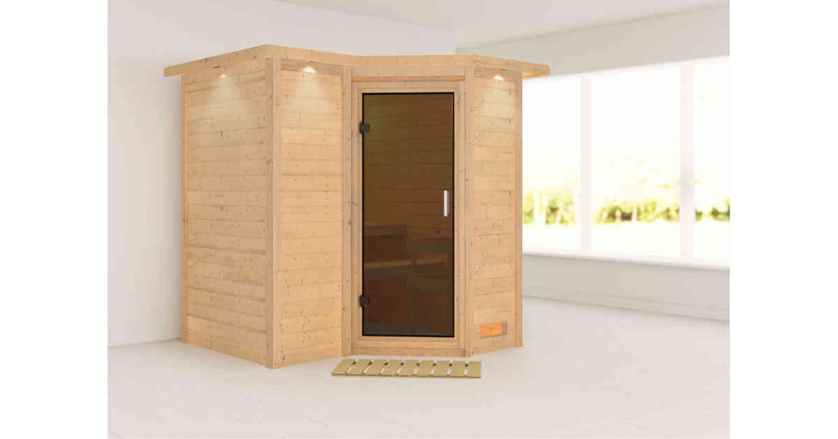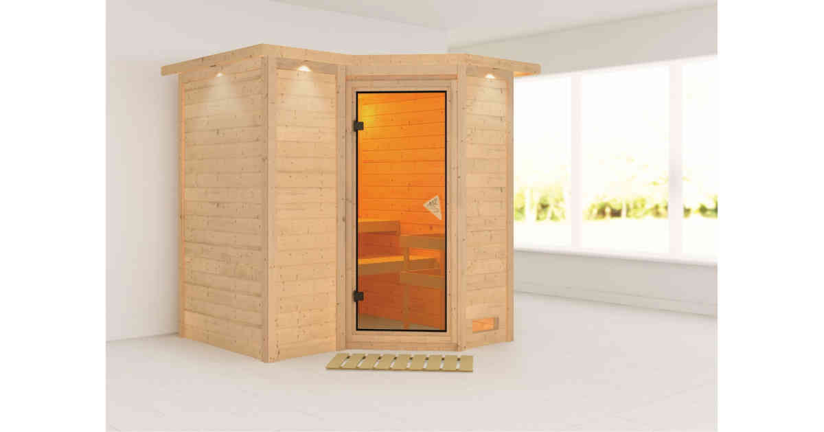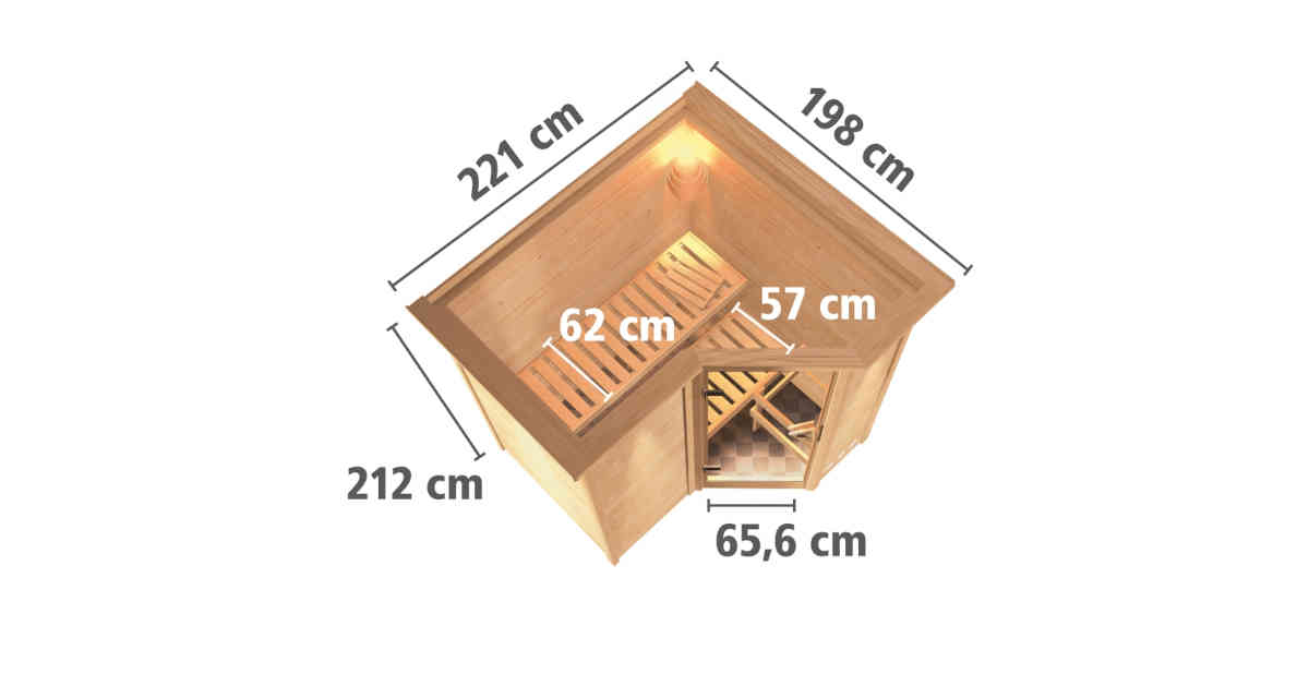 Mit der 38 mm Massivholzsauna Sahib 1 haben Sie die Möglichkeit, bei sich zuhause, eine eigene Oase zu schaffen. Nach einem anstrengenden Tag oder aber auch im Winter gibt es nichts besseres, als etwas wärme zu spüren. Die 38 mm Bohlen aus nordischem Fichtenholz werden im Steck-/ Schraubsystem montiert und durch die Vollholzwände kann die Wärme aus dem Saunainneren nicht entfliehen. Um die Sauna individueller zu gestalten, können Sie optional einen Dachkranz inkl. LED Spots hineinsetzten. Zudem haben Sie die Möglichkeit zwischen vier verschiedenen Türvarianten zu wählen, sodass für jeden etwas dabei ist. Ob eine Holztür, Isolierglas, klassisch mit einer bronzierten Ganzglastür, modern in einer Ganzglastür in graphitfarben oder schlicht mit einer klaren Ganzglastür. Hier können Sie die Sauna zu Ihrer Sauna machen. Mit der großzügigen Größe von 193 x 184 x 209 cm (B/T/H) haben Sie jede Menge Platz um auf andere Gedanken zu kommen. Erweitern Sie die Sauna mit dem optional zu erwerbenden 9kW-Bio-Kombiofen. Hier haben Sie neben der klassischen finnischen Sauna noch die Möglichkeiten eine Kräuter-Kur, ein Dampfbad und eine Familiensauna zu genießen. Teilen Sie das Erlebnis mit Ihrer Familie und tuen Sie sich etwas Gutes. Ein richtiges Saunagefühl kommt durch die Saunaliegen und einer Kopfstütze auf und wer einen besonderen Liegekomfort möchte, kann zur extra breiten Saunaliege von 62 cm Breite greifen. Um Sie vor Verbrennungen zu schützen ist ein Ofenschutzgitter am Saunaofen montiert. Um Ihre Atemwege zu befreien und wieder tief einzuatmen, ist optional ein Salzkristall Vital Sole oder eine Salzkristall-Leuchte erhältlich. Schaffen Sie sich Ihren kleinen Ruhetempel mit der Massivholzsauna Sahib 1.
