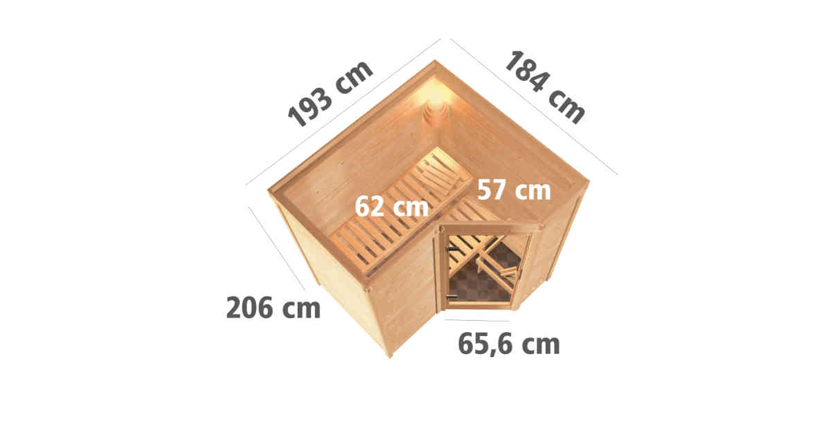 Mit der 38 mm Massivholzsauna Sahib 1 haben Sie die Möglichkeit, bei sich zuhause, eine eigene Oase zu schaffen. Nach einem anstrengenden Tag oder aber auch im Winter gibt es nichts besseres, als etwas wärme zu spüren. Die 38 mm Bohlen aus nordischem Fichtenholz werden im Steck-/ Schraubsystem montiert und durch die Vollholzwände kann die Wärme aus dem Saunainneren nicht entfliehen. Um die Sauna individueller zu gestalten, können Sie optional einen Dachkranz inkl. LED Spots hineinsetzten. Zudem haben Sie die Möglichkeit zwischen vier verschiedenen Türvarianten zu wählen, sodass für jeden etwas dabei ist. Ob eine Holztür, Isolierglas, klassisch mit einer bronzierten Ganzglastür, modern in einer Ganzglastür in graphitfarben oder schlicht mit einer klaren Ganzglastür. Hier können Sie die Sauna zu Ihrer Sauna machen. Mit der großzügigen Größe von 193 x 184 x 209 cm (B/T/H) haben Sie jede Menge Platz um auf andere Gedanken zu kommen. Erweitern Sie die Sauna mit dem optional zu erwerbenden 9kW-Bio-Kombiofen. Hier haben Sie neben der klassischen finnischen Sauna noch die Möglichkeiten eine Kräuter-Kur, ein Dampfbad und eine Familiensauna zu genießen. Teilen Sie das Erlebnis mit Ihrer Familie und tuen Sie sich etwas Gutes. Ein richtiges Saunagefühl kommt durch die Saunaliegen und einer Kopfstütze auf und wer einen besonderen Liegekomfort möchte, kann zur extra breiten Saunaliege von 62 cm Breite greifen. Um Sie vor Verbrennungen zu schützen ist ein Ofenschutzgitter am Saunaofen montiert. Um Ihre Atemwege zu befreien und wieder tief einzuatmen, ist optional ein Salzkristall Vital Sole oder eine Salzkristall-Leuchte erhältlich. Schaffen Sie sich Ihren kleinen Ruhetempel mit der Massivholzsauna Sahib 1.