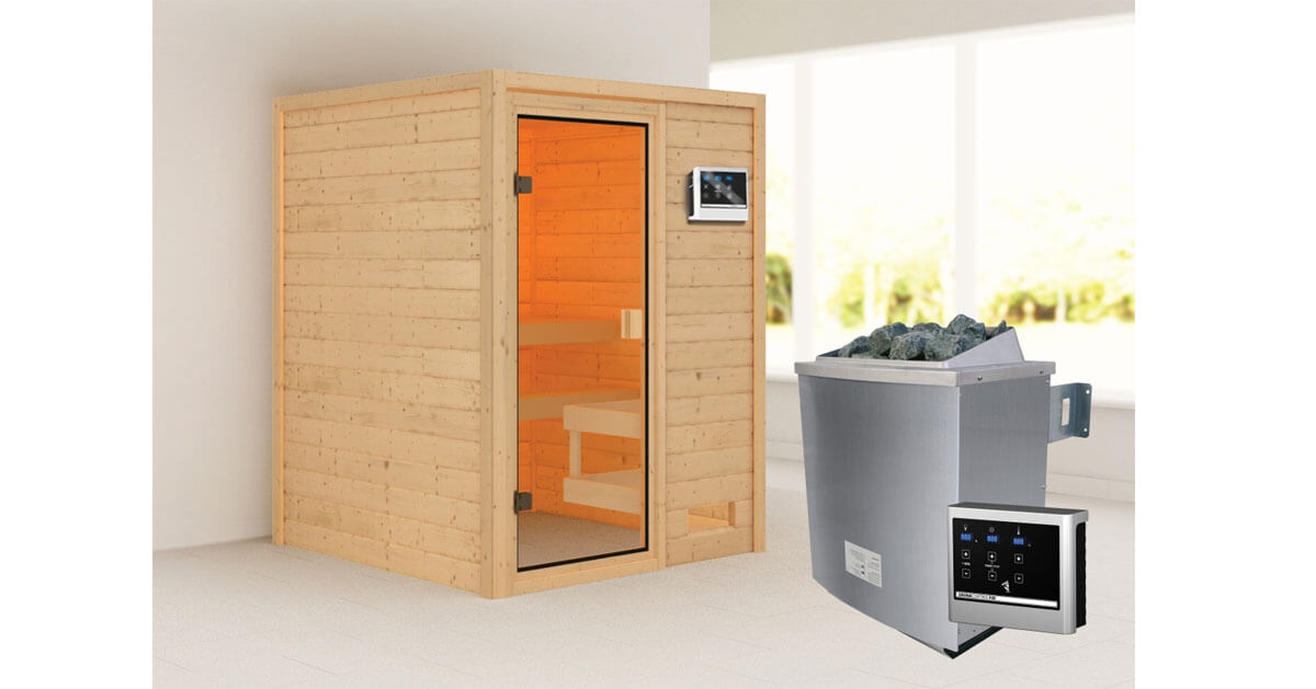Karibu 38mm Massivholzsauna Sandra mit 9kW Saunaofen mit ext. Steuerung Easy